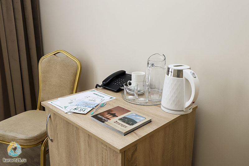 холодильник, кондиционер, телевизор, набор чайной посуды, душ, шкаф, односпальная кровать: 2 шт, две прикроватные тумбочки, электрочайник
