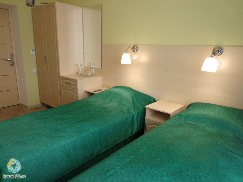 холодильник, телевизор, фен, душ, шкаф, односпальная кровать: 2 шт, две прикроватные тумбочки