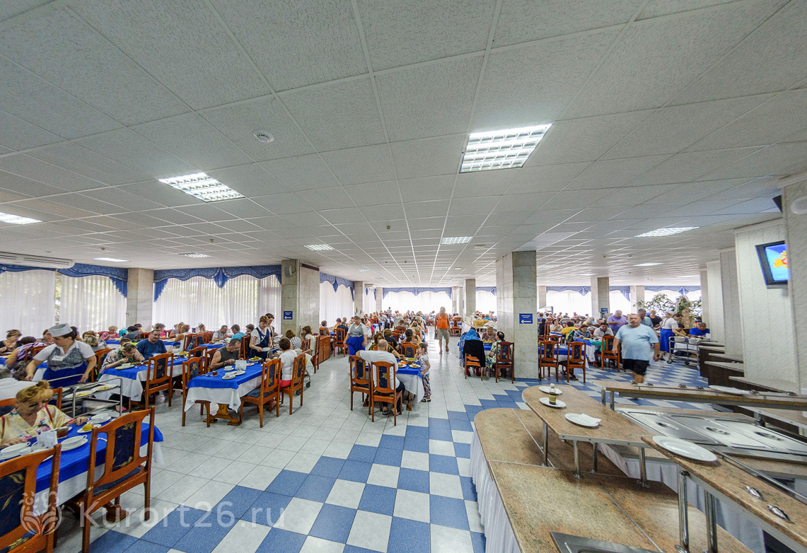 Питание в санатории 4-разовое, но по показаниям вам могут назначить 5-разовый рацион. Организовано по системе «Меню-заказ». Также в санатории есть услуга питания с элементами «шведского стола»: вы сможете выбрать свежие овощи и фрукты на витрине салат-бара и «собрать» салат из собственных ингредиентов.