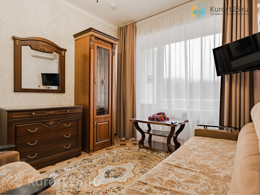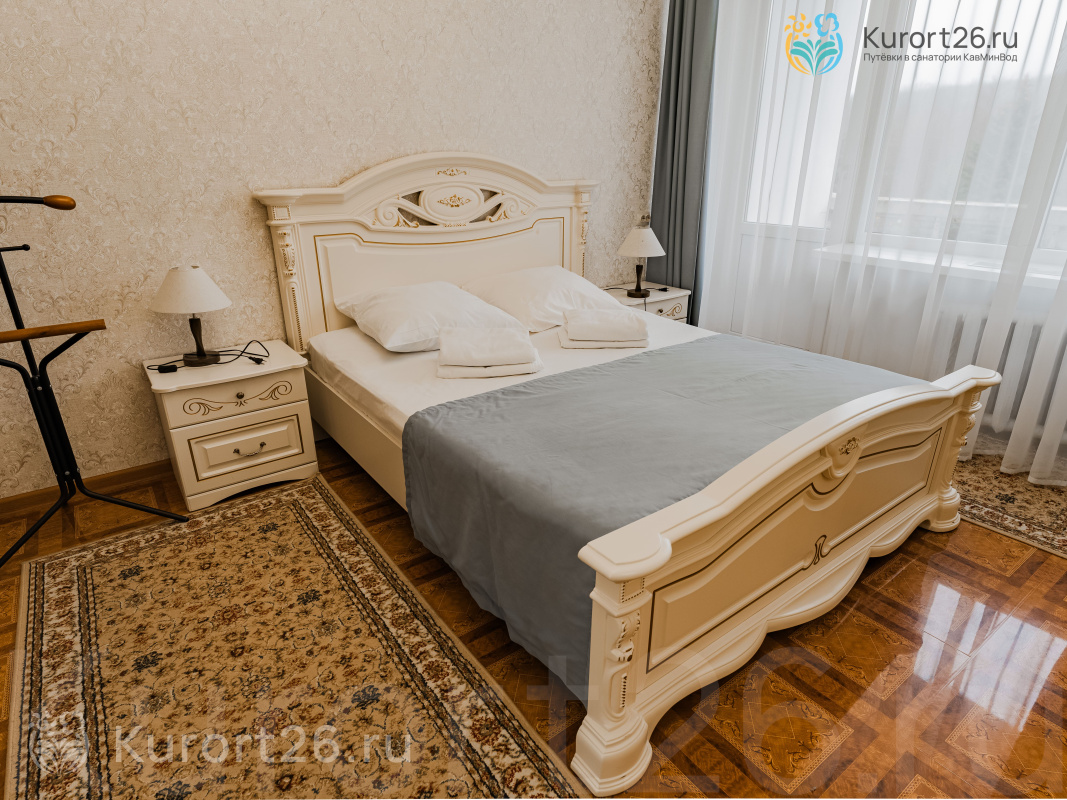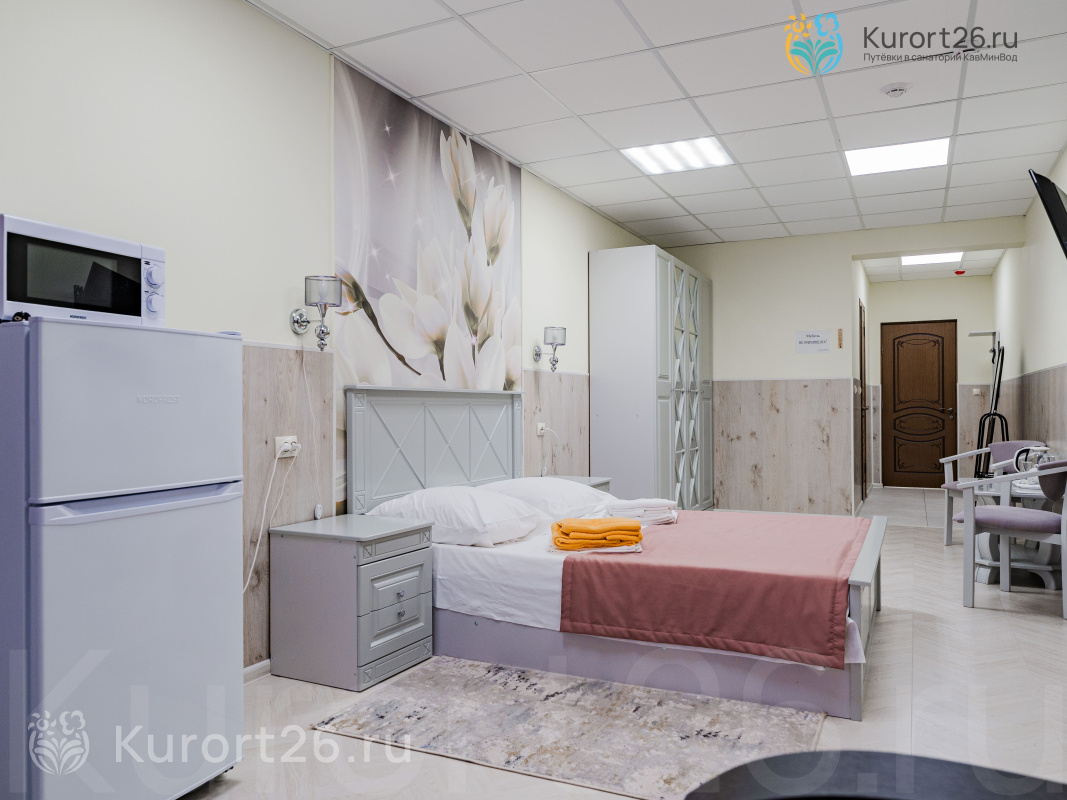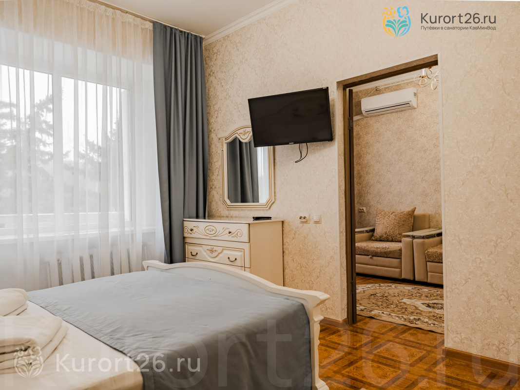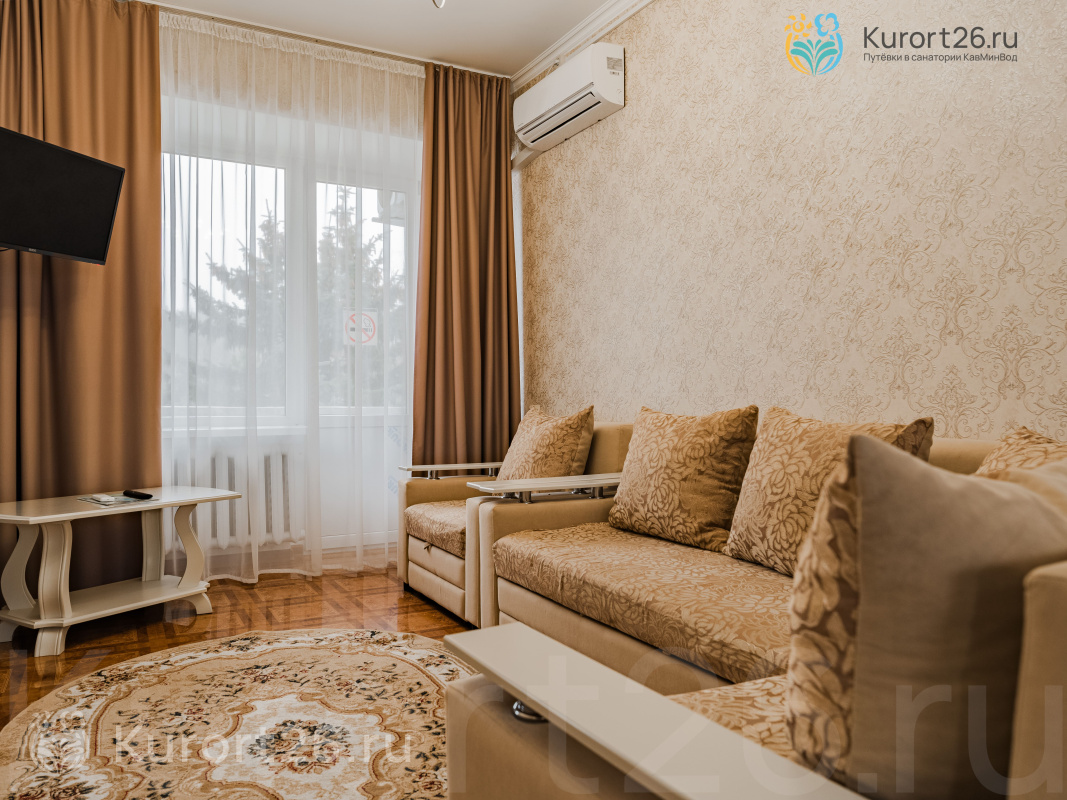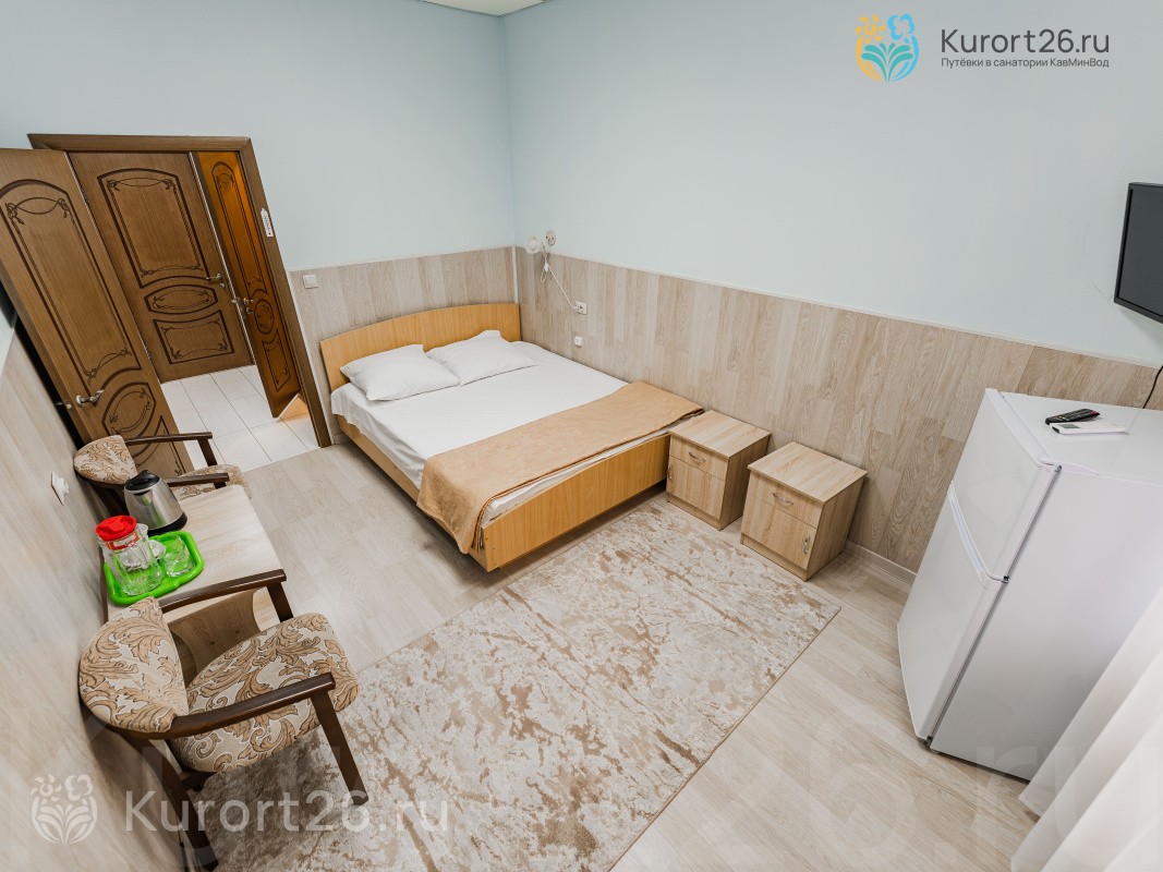 В санатории комфортные номера с видом на гору Бештау или Машук. Везде хорошая шумоизоляция, есть балконы, ортопедические матрасы, холодильник, телевизор, чайник, посуда и фен.