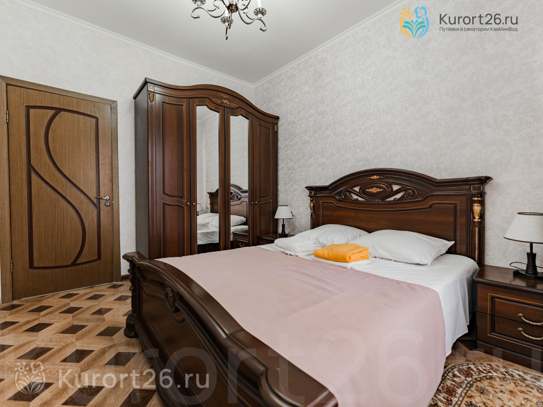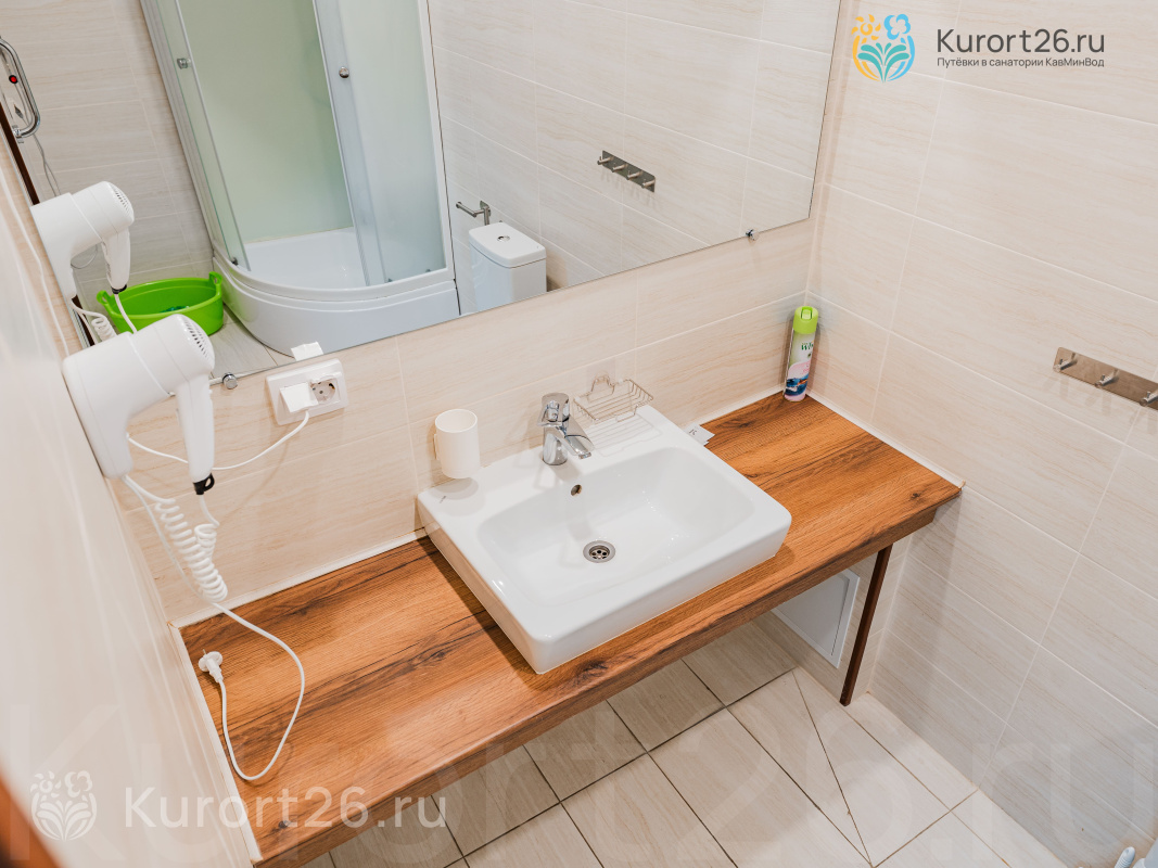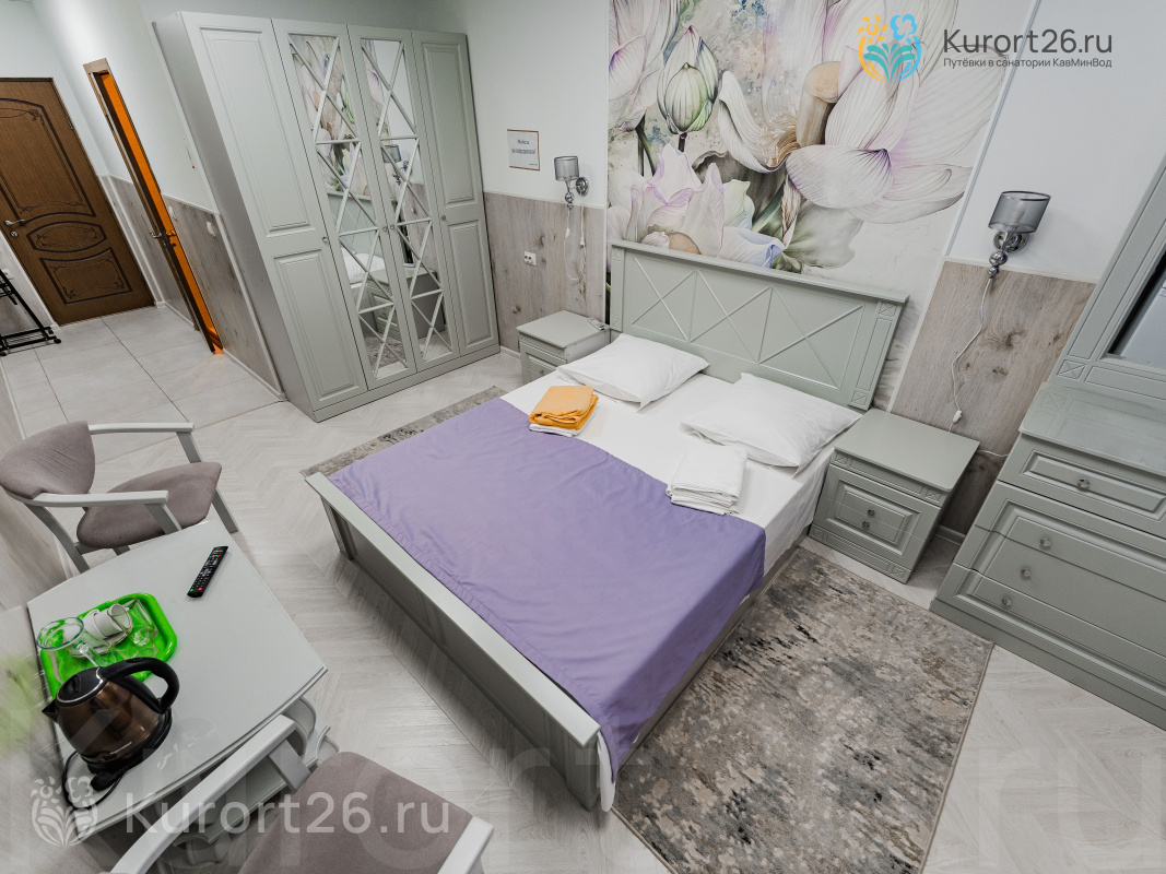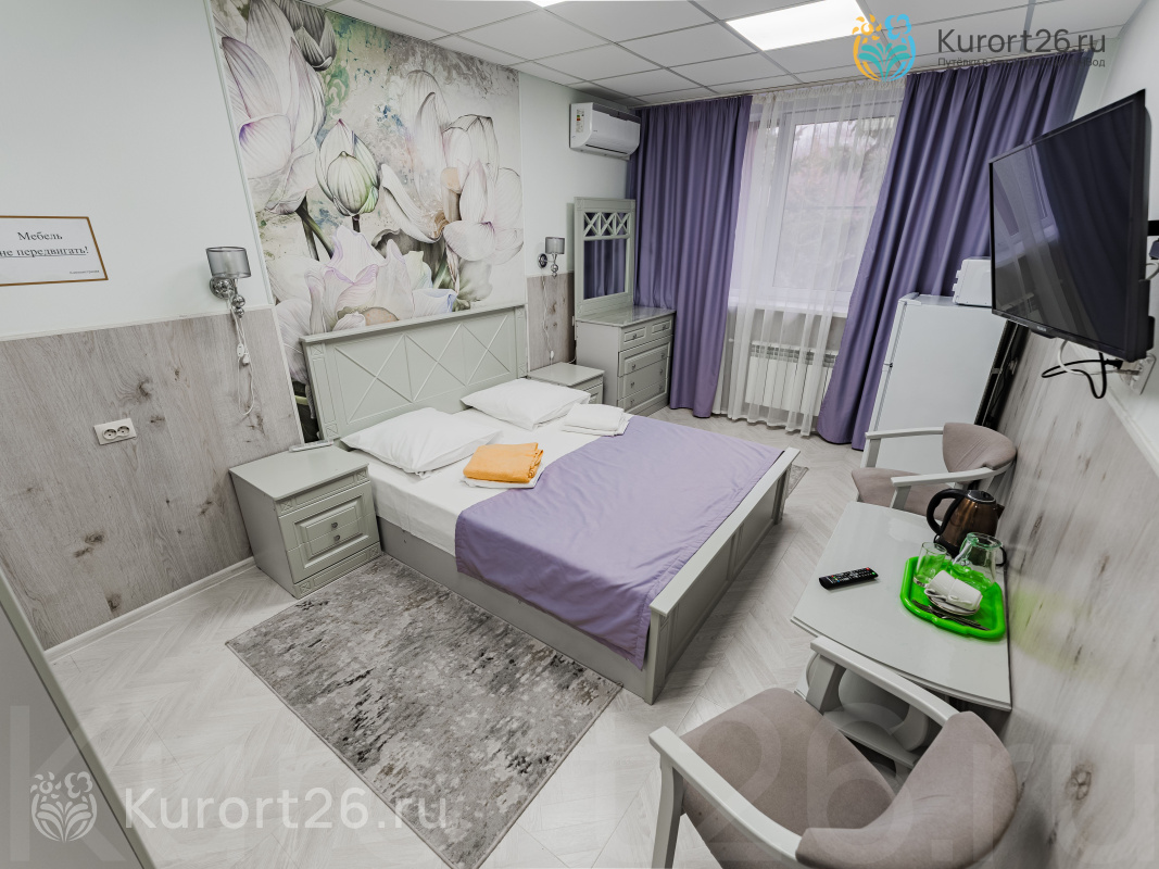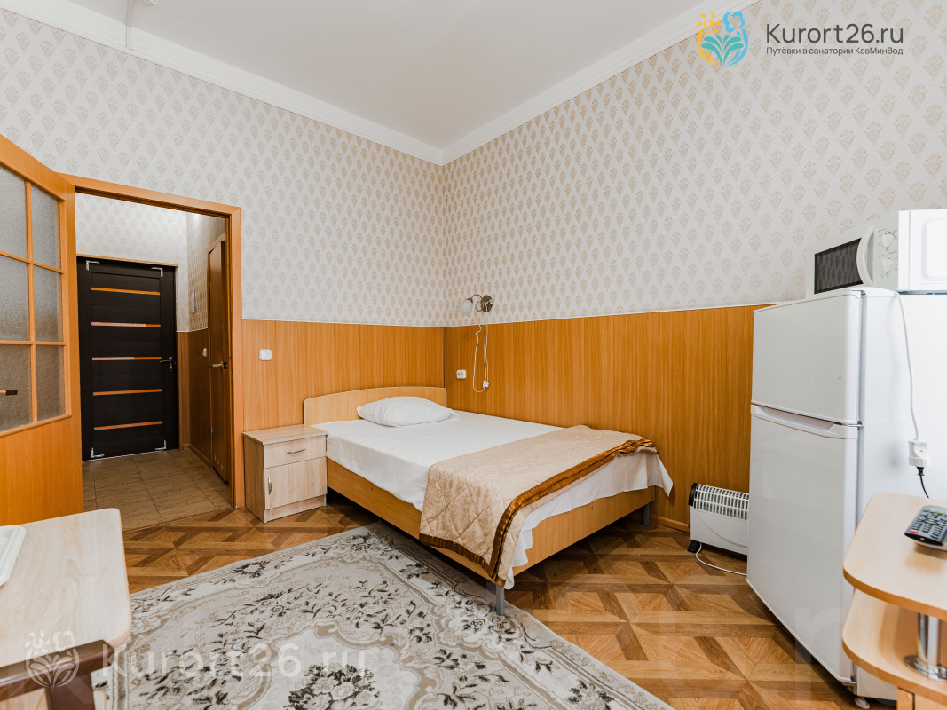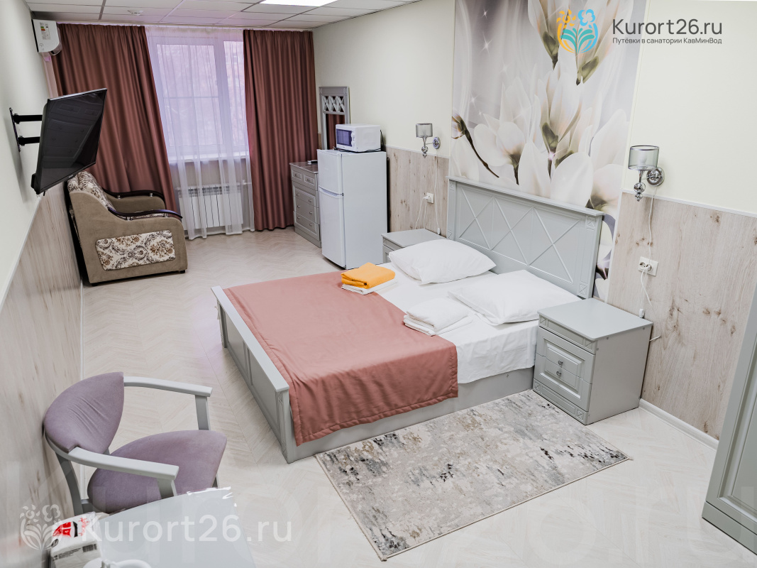 В санатории комфортные номера с видом на гору Бештау или Машук. Везде хорошая шумоизоляция, есть балконы, ортопедические матрасы, холодильник, телевизор, чайник, посуда и фен.