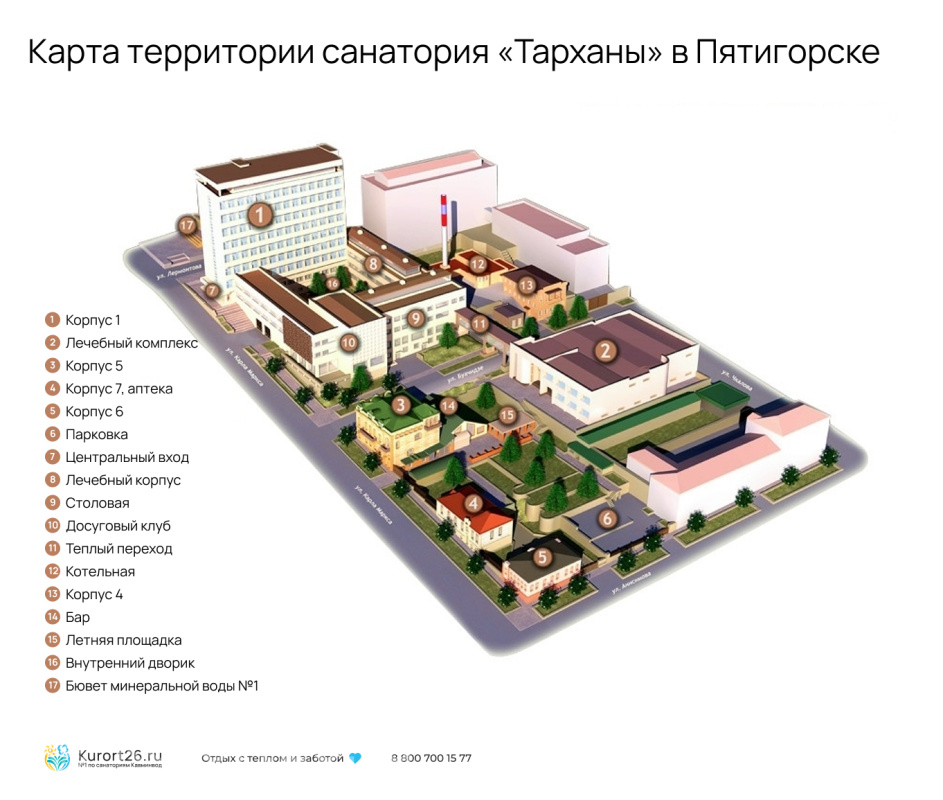 Санаторий «Тарханы» расположен в историческом центре Пятигорска, напротив музея М.Ю. Лермонтова. Здравница появилась здесь в 1973 году, и её название напрямую связано с именем поэта и поместьем «Тарханы», где он вырос.
