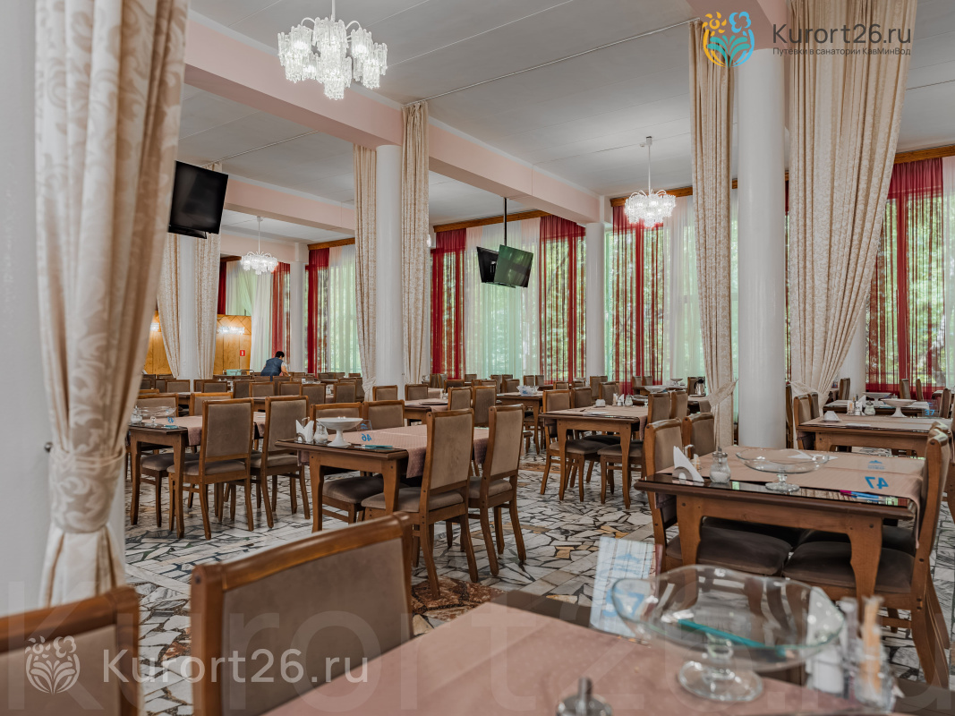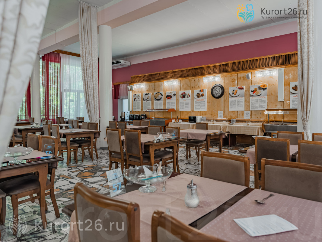 Питание в санатории «Бештау» диетическое, проходит в просторном обеденном зале. В меню — блюда из мяса и рыбы, салаты и запеканки, овощи и фрукты, выпечка и десерты, кисломолочные продукты. Все блюда отварные или паровые, малосоленые.