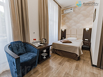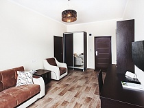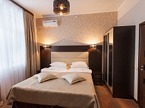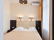 холодильник, кондиционер, фен, сейф, телефон, тапочки, камин, двуспальная кровать, шкаф, прикроватные тумбочки, мягкая мебель, утюг с гладильной доской, микроволновая печь, электрочайник, стол, зеркало, два телевизора, стул, набор полотенец, две ванные комнаты