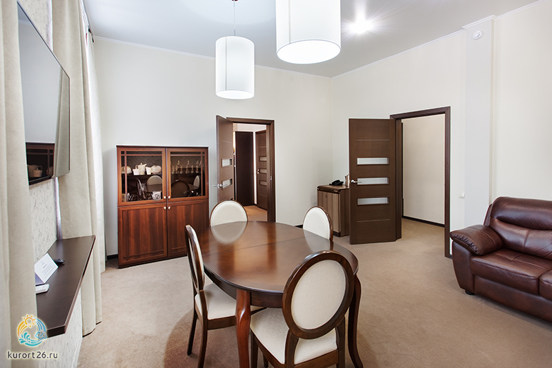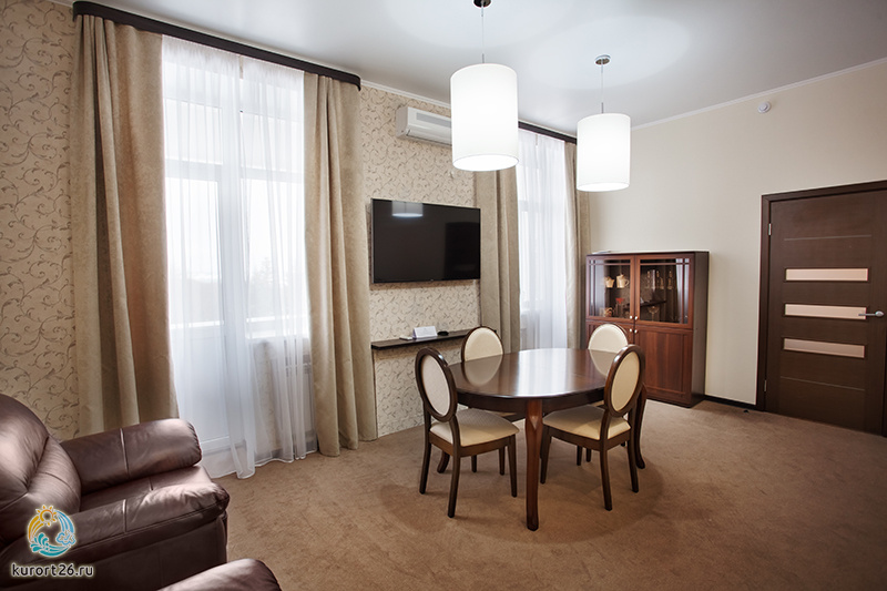 холодильник, кондиционер, фен, сейф, телефон, тапочки, камин, двуспальная кровать, шкаф, прикроватные тумбочки, мягкая мебель, утюг с гладильной доской, микроволновая печь, электрочайник, стол, зеркало, два телевизора, стул, набор полотенец, две ванные комнаты