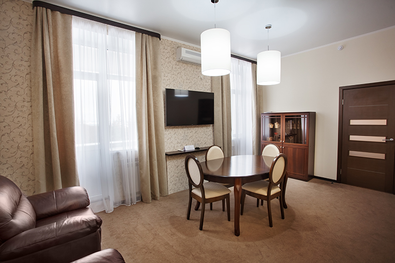 холодильник, кондиционер, фен, сейф, телефон, тапочки, камин, двуспальная кровать, шкаф, прикроватные тумбочки, мягкая мебель, утюг с гладильной доской, микроволновая печь, электрочайник, стол, зеркало, два телевизора, стул, набор полотенец, две ванные комнаты