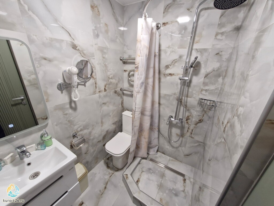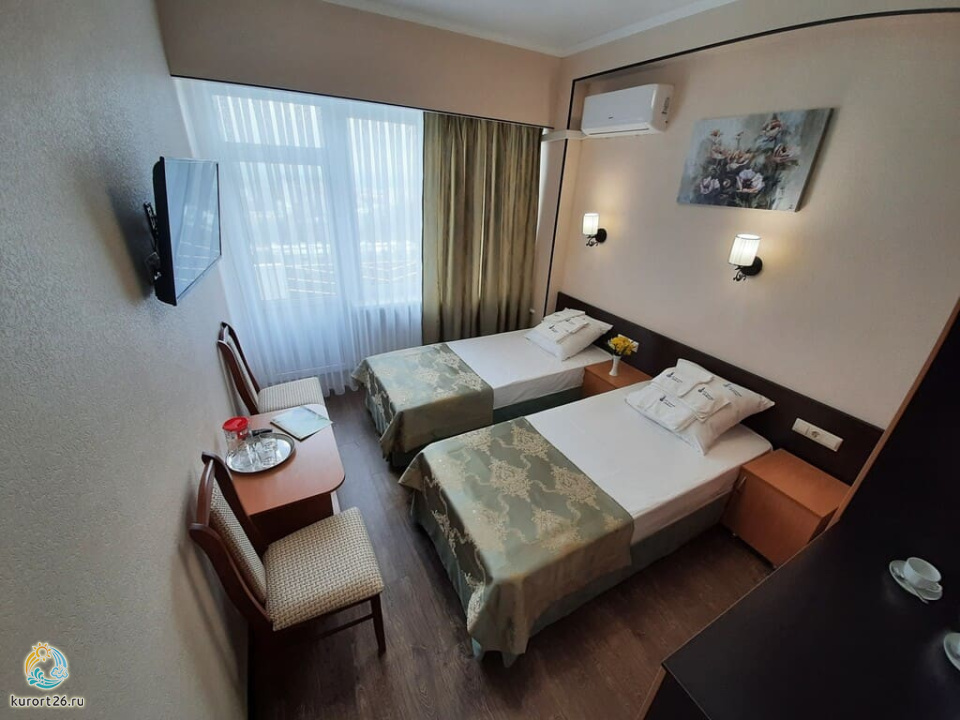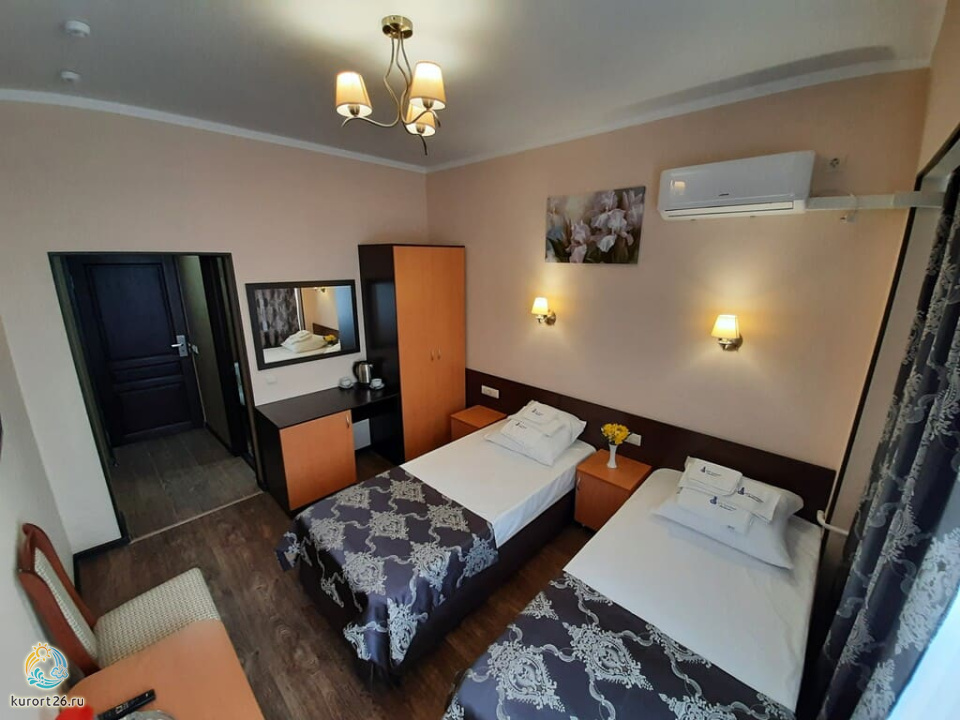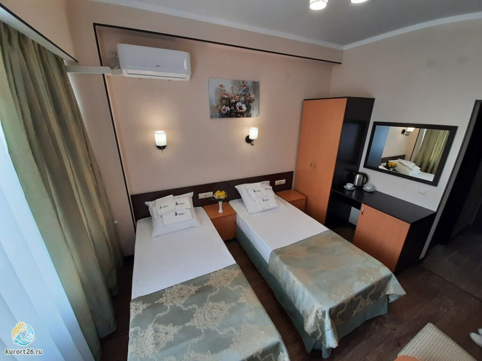 холодильник, телевизор, фен, сейф, душ, ванные принадлежности, халат, диван, две тумбочки, электрочайник, стол, зеркало, сплит-система, кресло, две односпальные кровати