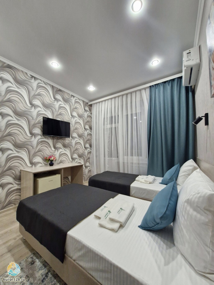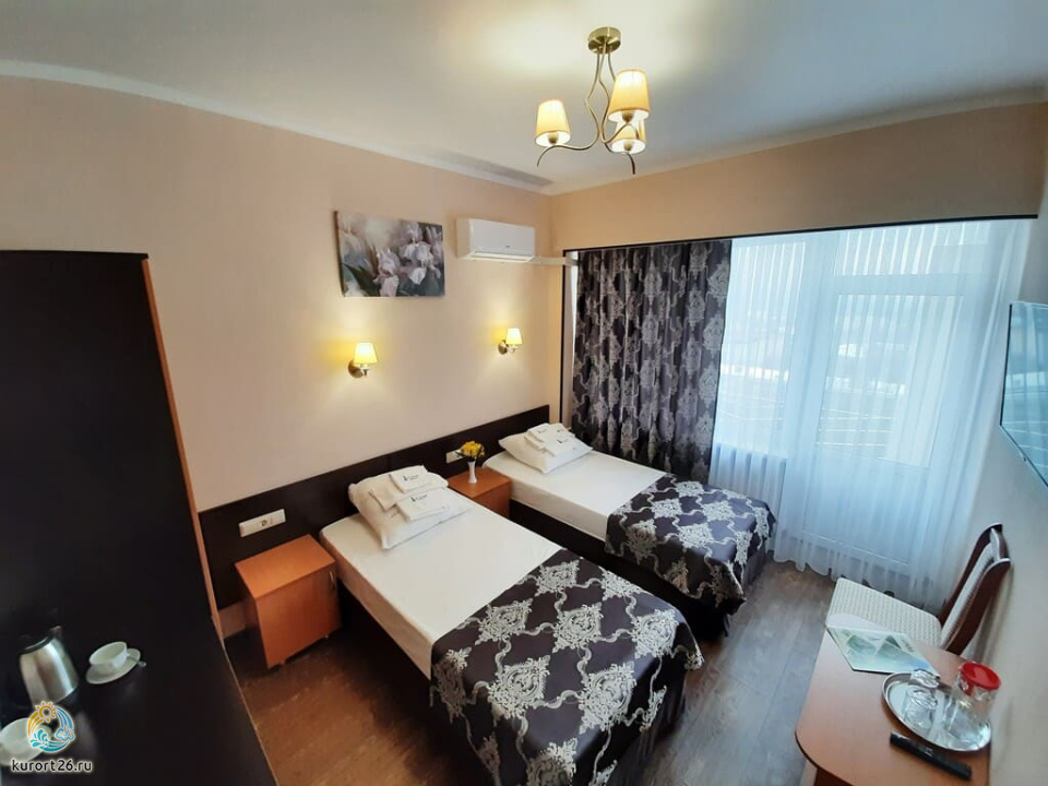 холодильник, телевизор, фен, телефон, санузел с душевой кабиной, ванные принадлежности, прикроватные тумбочки, электрочайник, сплит-система, ванная комната, две односпальные кровати