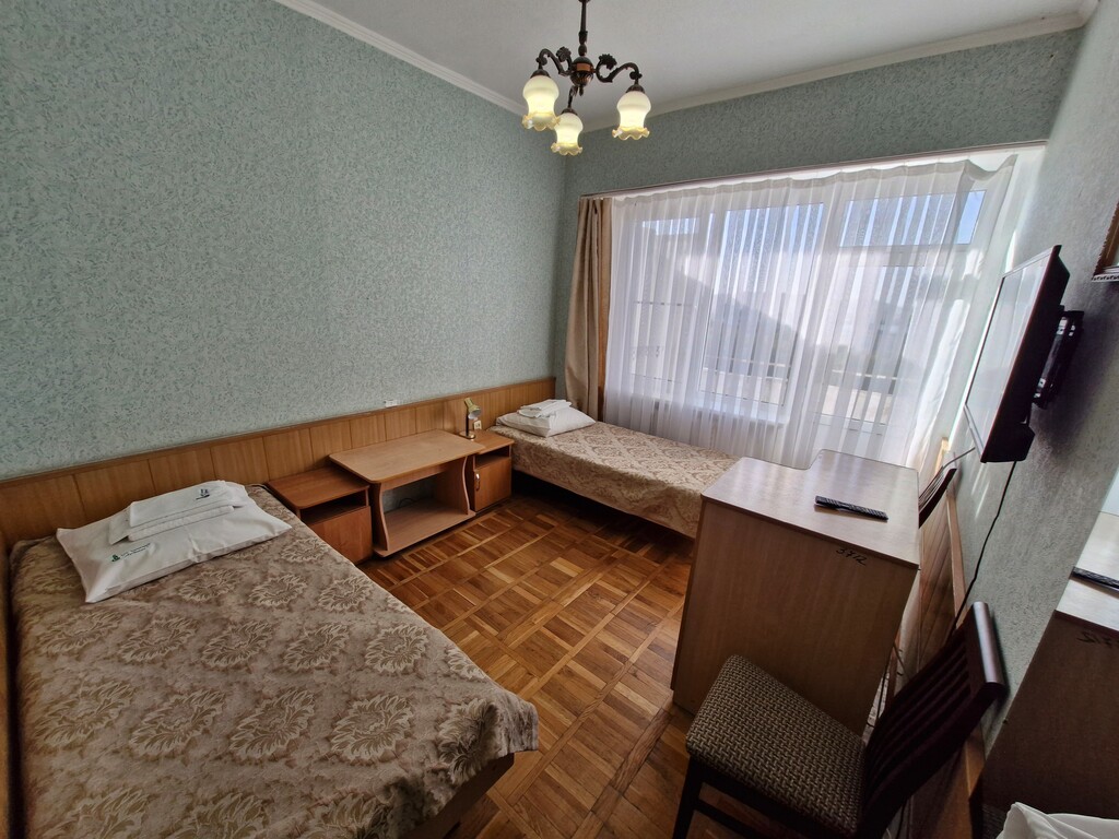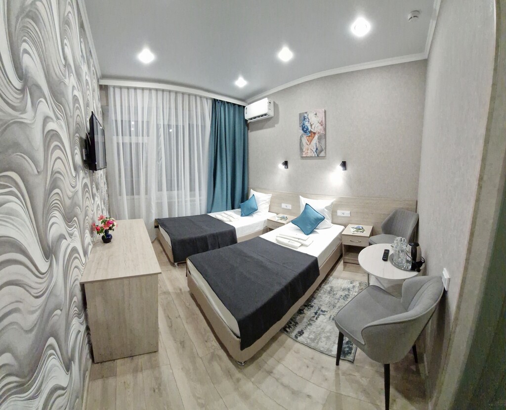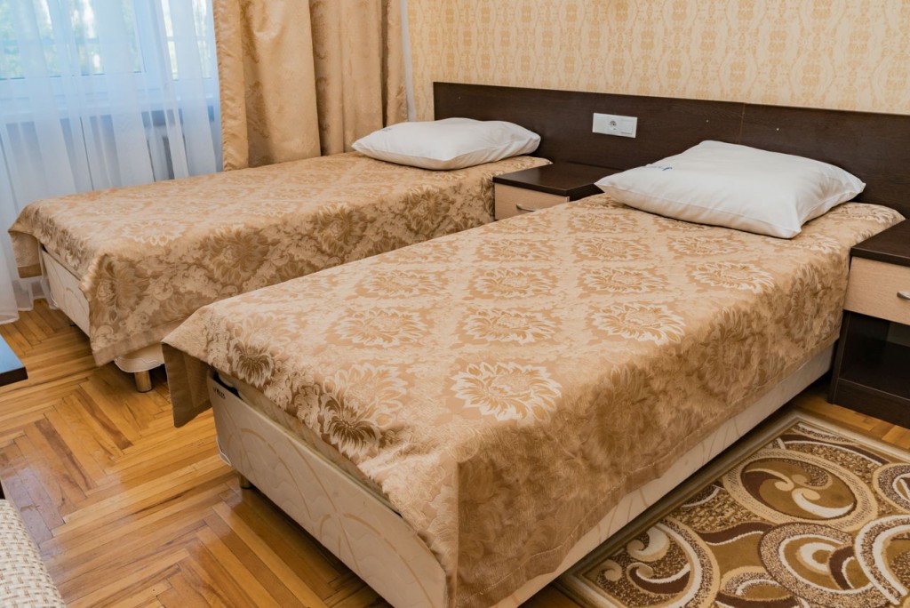 холодильник, телевизор, фен, телефон, санузел с душевой кабиной, ванные принадлежности, прикроватные тумбочки, электрочайник, сплит-система, ванная комната, две односпальные кровати