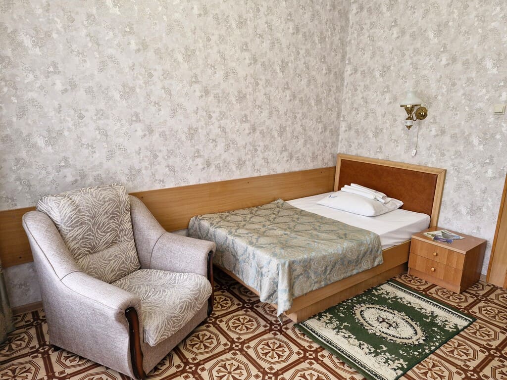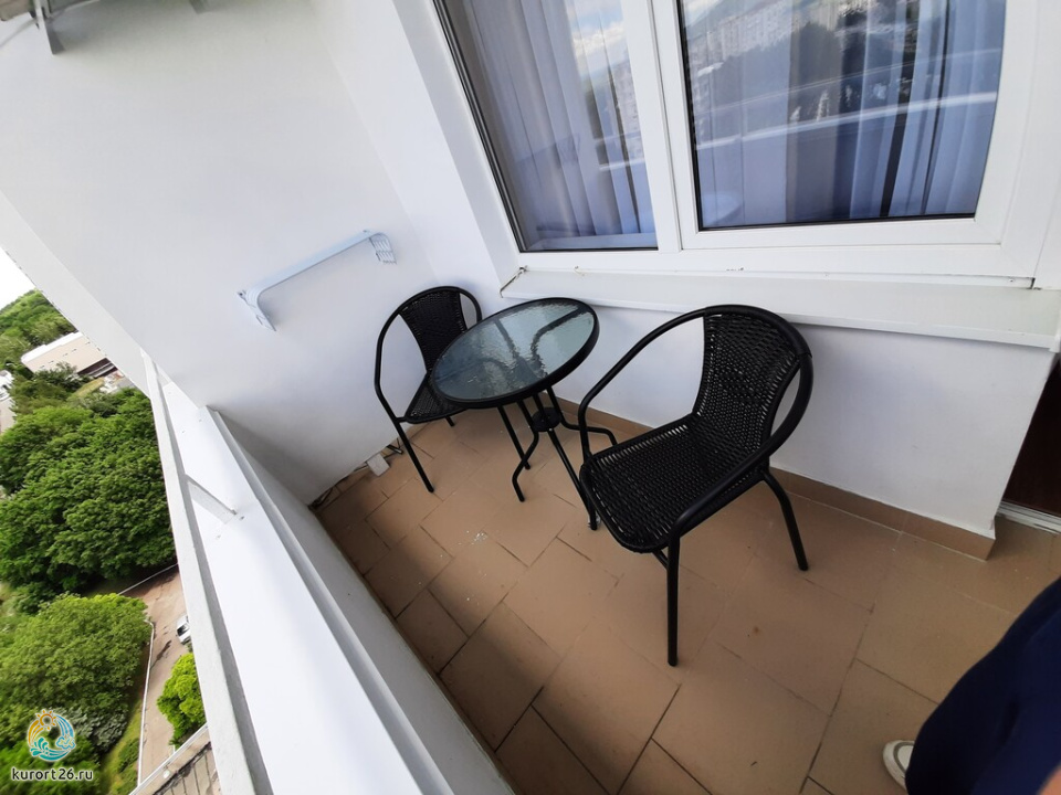 холодильник, телевизор, фен, балкон, сейф, душ, ванные принадлежности, халат, шкаф, односпальная кровать, электрочайник, стол, зеркало, сплит-система, посуда