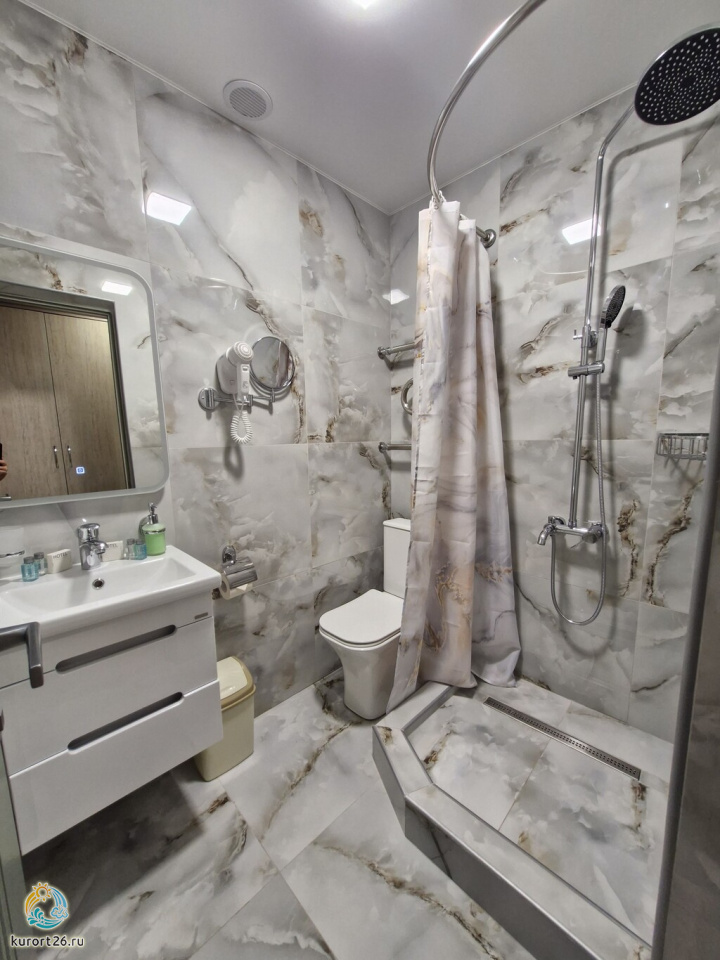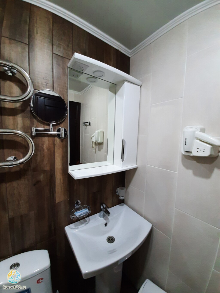 холодильник, кондиционер, телевизор, сейф, халат, двуспальная кровать, обеденный стол, утюг с гладильной доской, диван, два санузла с ванной/душем, посуда, биде, комод с зеркалом