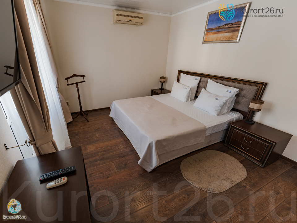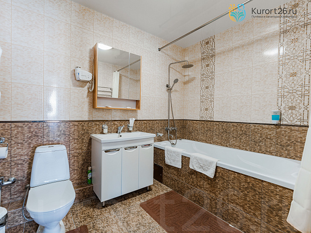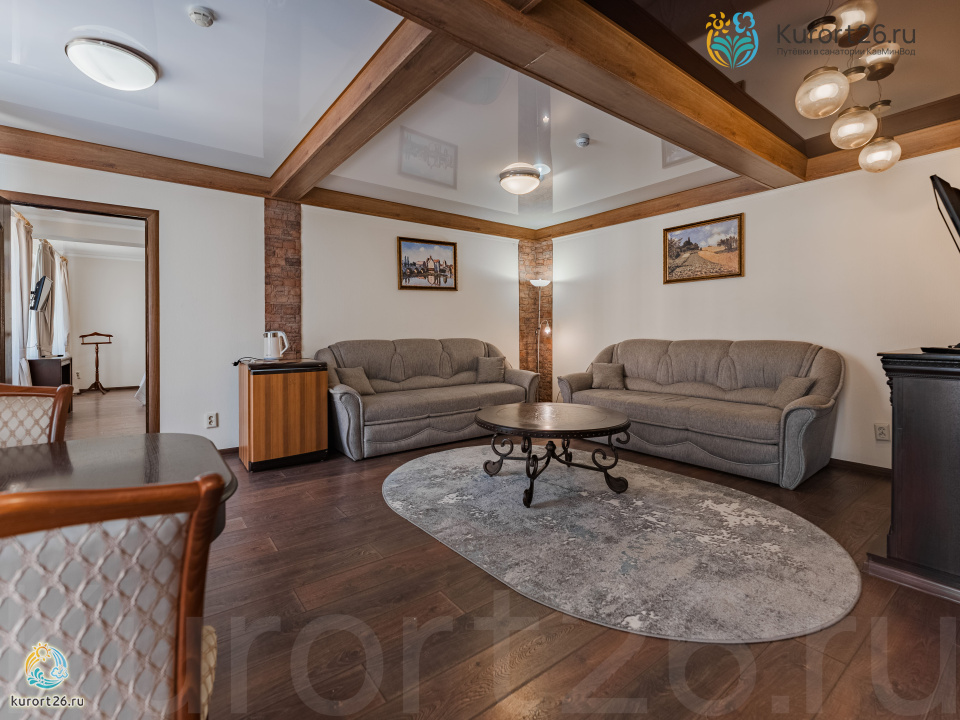 холодильник, телевизор, фен, набор чайной посуды, сейф, ванные принадлежности, двуспальная кровать, набор мягкой мебели, прикроватные тумбочки, электрочайник, стол, ванная комната, кресло, журнальный столик, набор полотенец