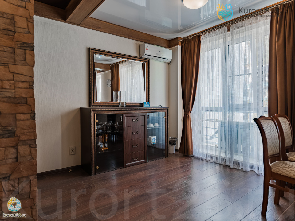 холодильник, кондиционер, фен, набор чайной посуды, сейф, ванные принадлежности, двуспальная кровать, шкаф, набор мягкой мебели, прикроватные тумбочки, диван, электрочайник, стол, ванная комната, журнальный столик, набор полотенец