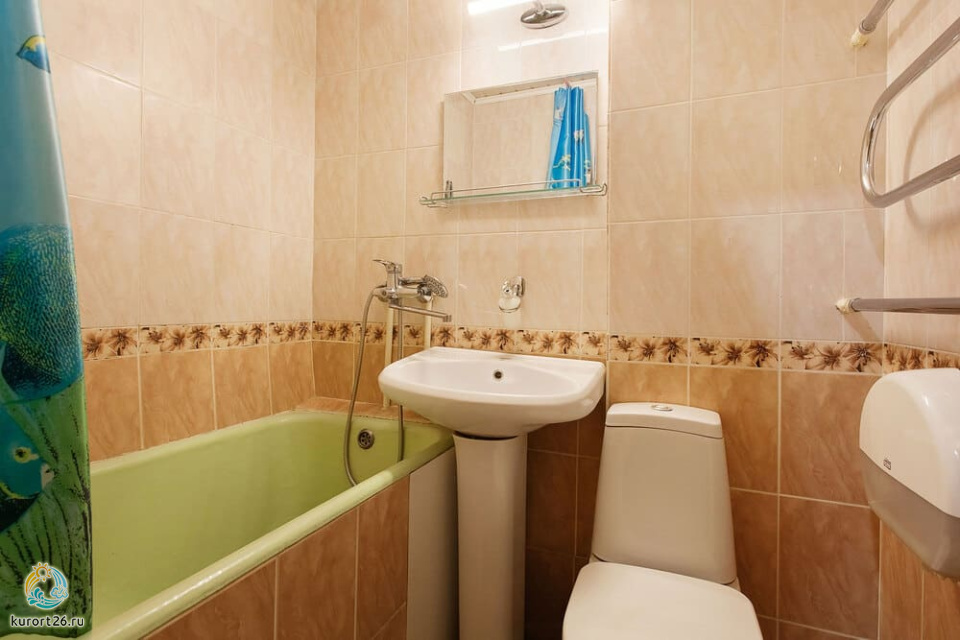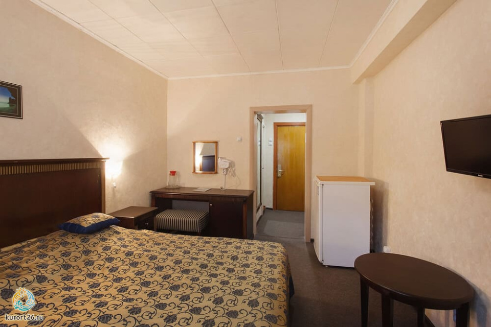 холодильник, телевизор, фен, ванные принадлежности, односпальная кровать, ванная комната, кресло, журнальный столик, набор полотенец