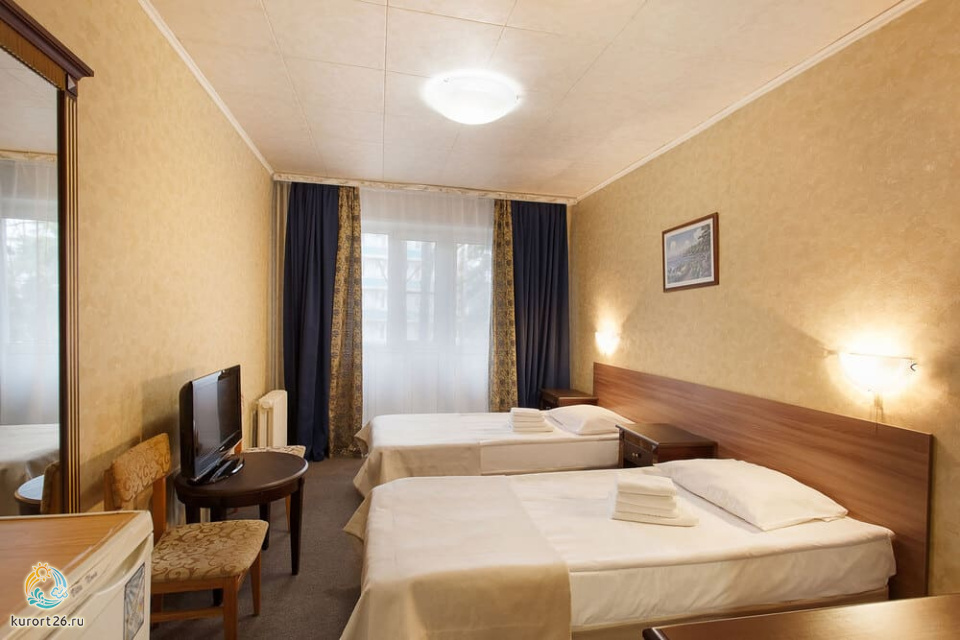 холодильник, кондиционер, телевизор, фен, ванные принадлежности, прикроватные тумбочки, односпальная кровать: 2 шт, электрочайник, ванная комната, кресло, набор полотенец