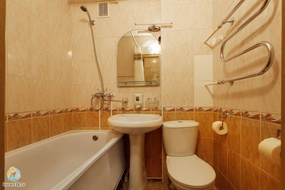 холодильник, телевизор, фен, ванные принадлежности, односпальная кровать, ванная комната, кресло, журнальный столик, набор полотенец