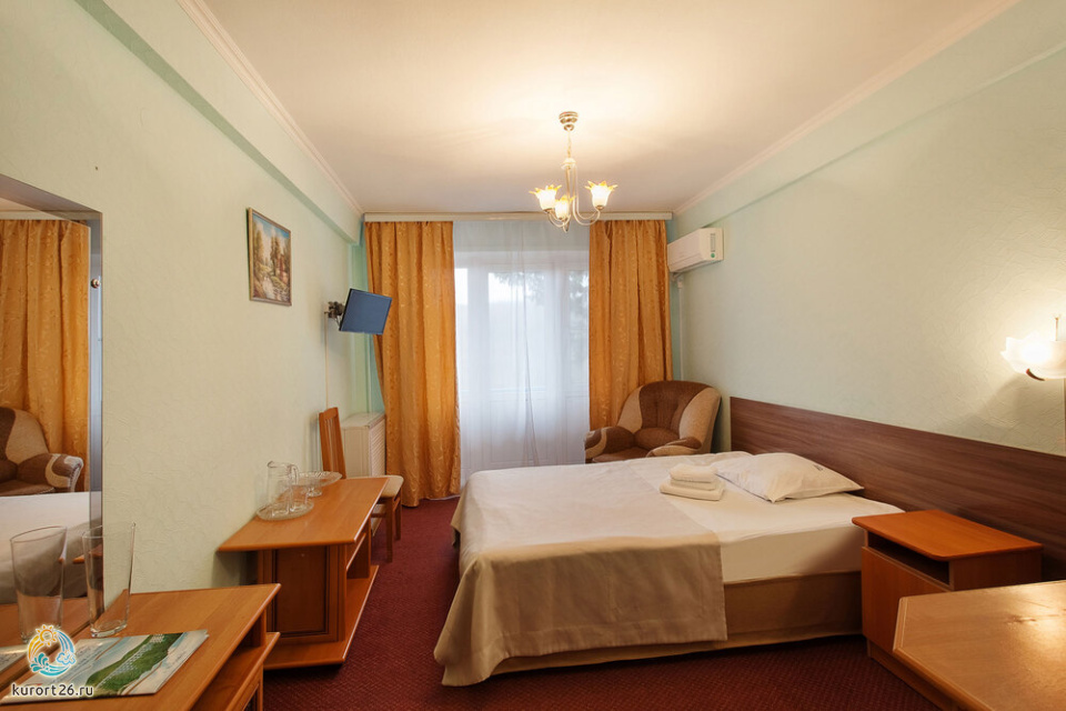 холодильник, кондиционер, телевизор, фен, ванные принадлежности, прикроватные тумбочки, односпальная кровать: 2 шт, электрочайник, ванная комната, кресло, набор полотенец