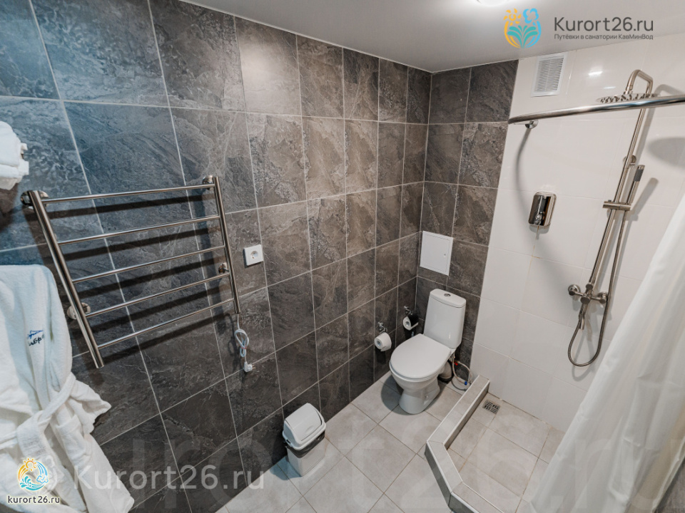 холодильник, телевизор, фен, ванные принадлежности, односпальная кровать, ванная комната, кресло, журнальный столик, набор полотенец