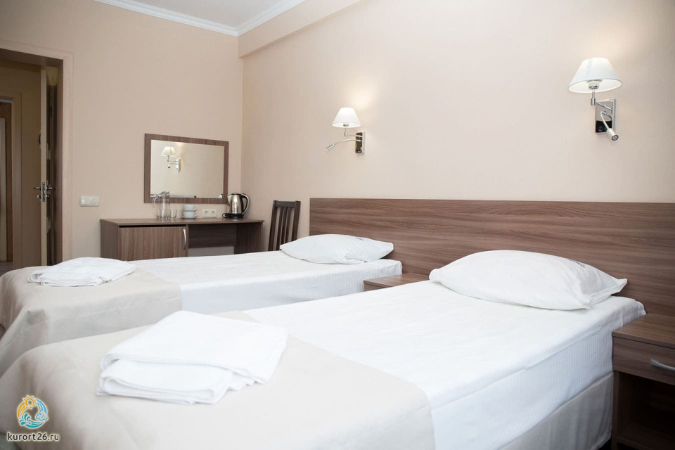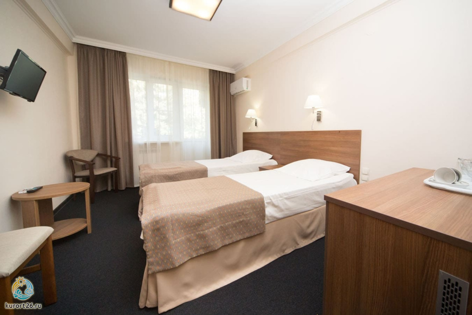 холодильник, кондиционер, телевизор, фен, ванные принадлежности, прикроватные тумбочки, односпальная кровать: 2 шт, электрочайник, ванная комната, кресло, набор полотенец