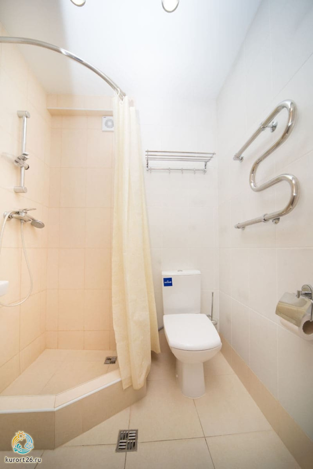 холодильник, телевизор, фен, ванные принадлежности, односпальная кровать, ванная комната, кресло, журнальный столик, набор полотенец