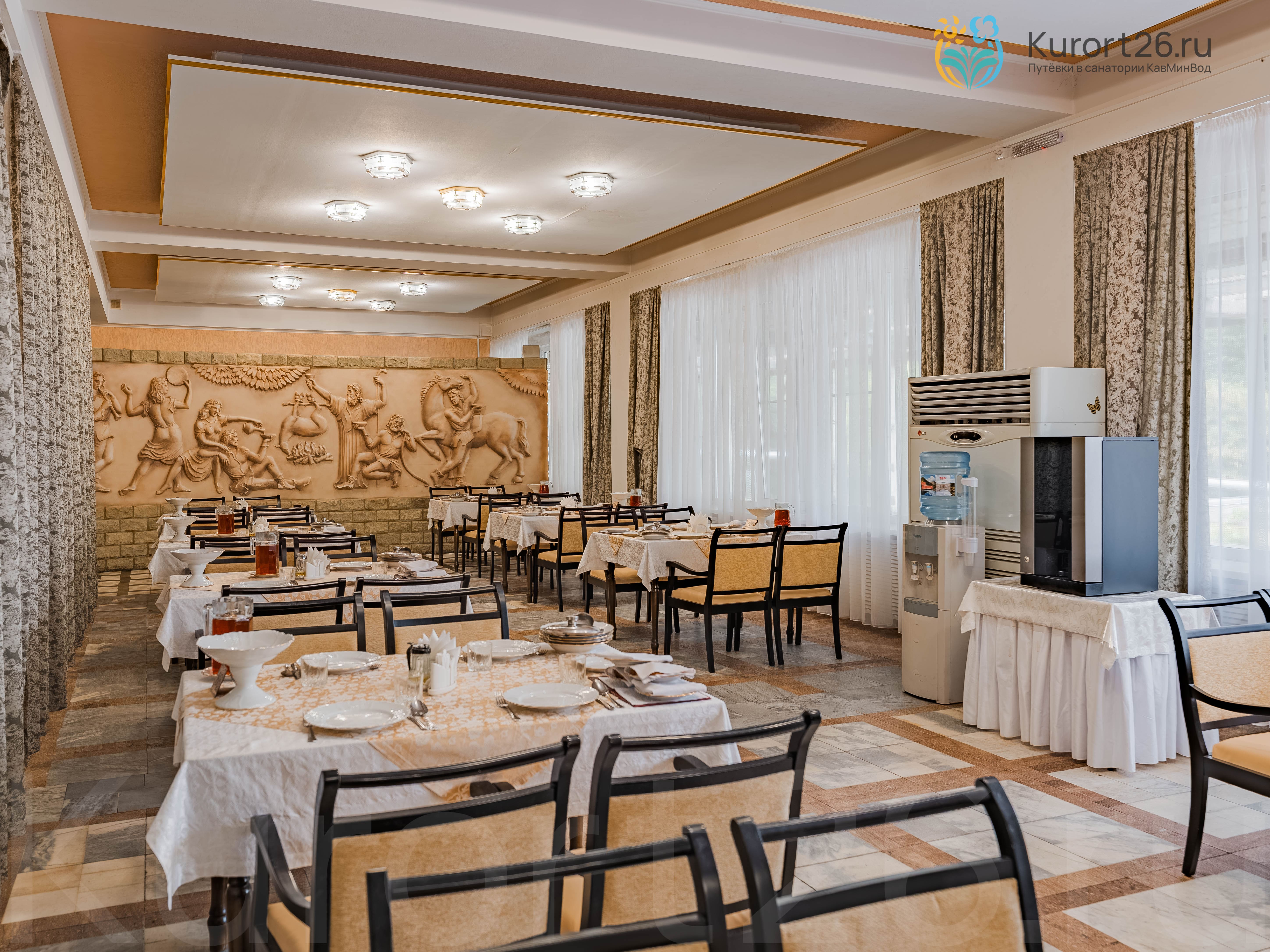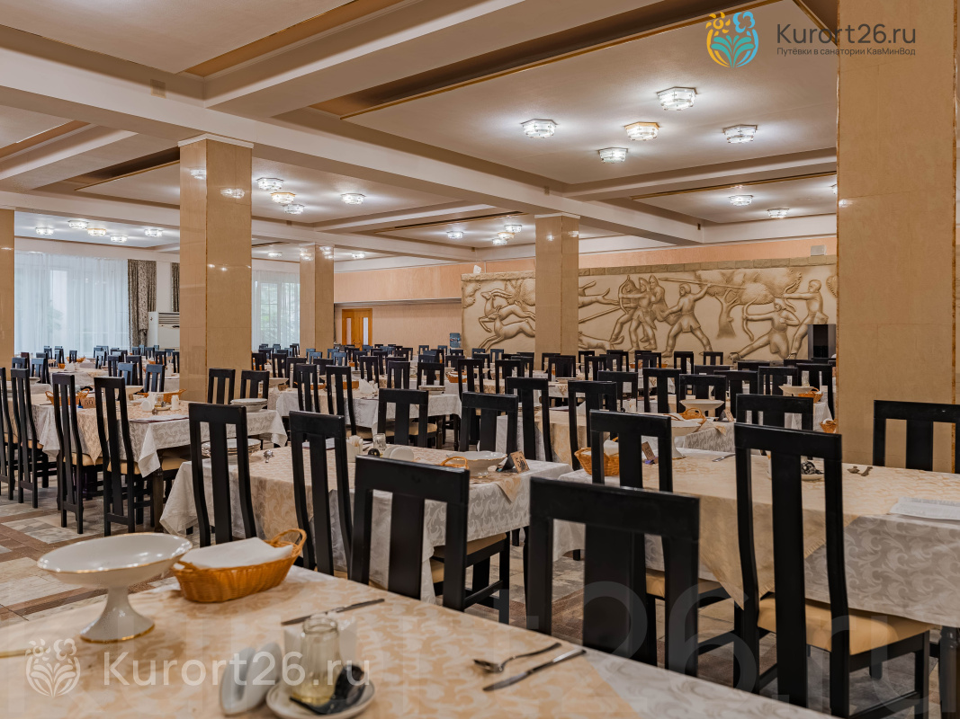 Питание проходит в просторном и светлом обеденном зале, стены которого украшены барельефами и статуями. Часто приём пищи сопровождает живая музыка. Поскольку в здравнице действует заказная система блюд, ежедневно каждый гость выбирает из нескольких вариантов закусок, первых и вторых блюд. Еда готовится из свежих экологически чистых продуктов: мяса, птицы, рыбы, морепродуктов, круп. Всегда в меню: свежие и тушёные овощи, свежие фрукты, соки, кисломолочные продукты, выпечка и десерты собственного производства. В рационе используются овсяный и отрубной отвары.