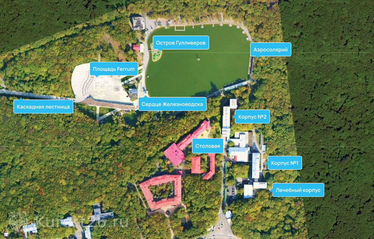Санаторий состоит из 3 корпусов: 2 спальных и лечебно-диагностического центра. Между ними находятся столовая и киноконцертный зал. Все помещения соединены между собой тёплыми коридорами.