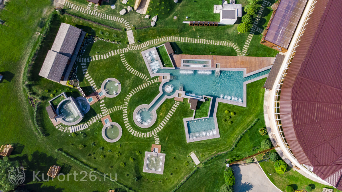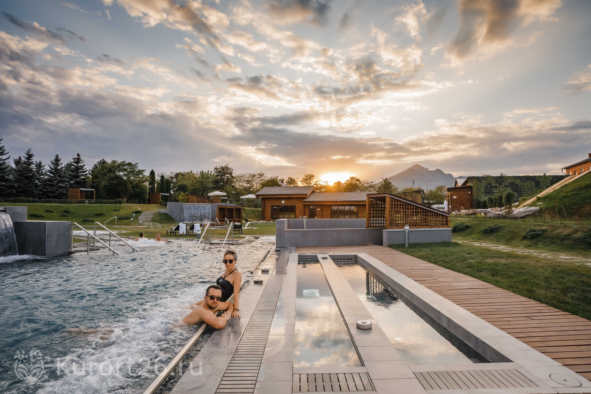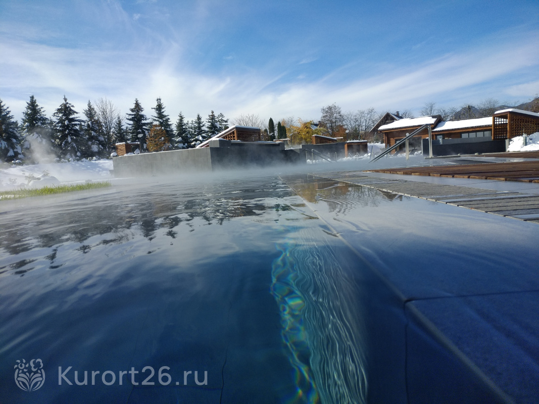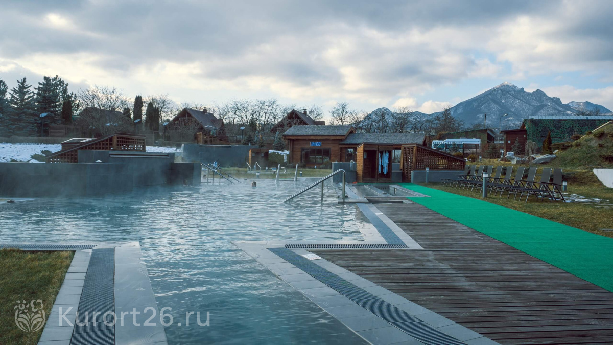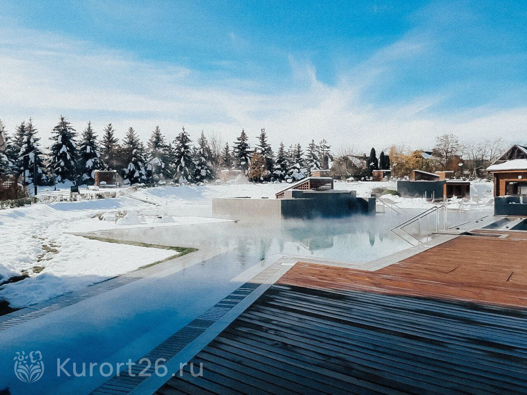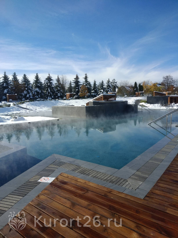 В комплексе есть большой открытый релакс-бассейн 110 кв.м с выплывом из закрытой части. Здесь же несколько открытых бассейнов с горячими минеральными источниками: три бассейна со 100% минерализацией и один с 50%. Температура источников 36 °C , что позволяет наслаждаться термальными процедурами в любое время года. Также снаружи находятся русские бани — можно окунуться в источник сразу после парной.