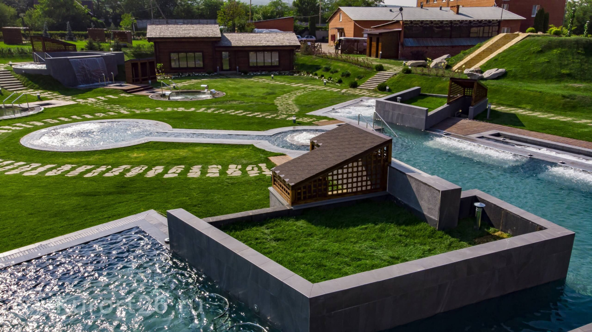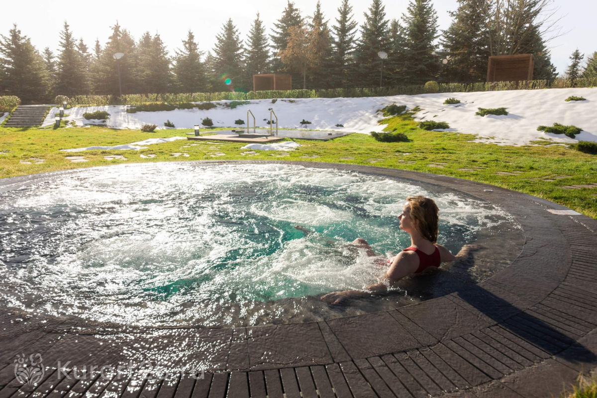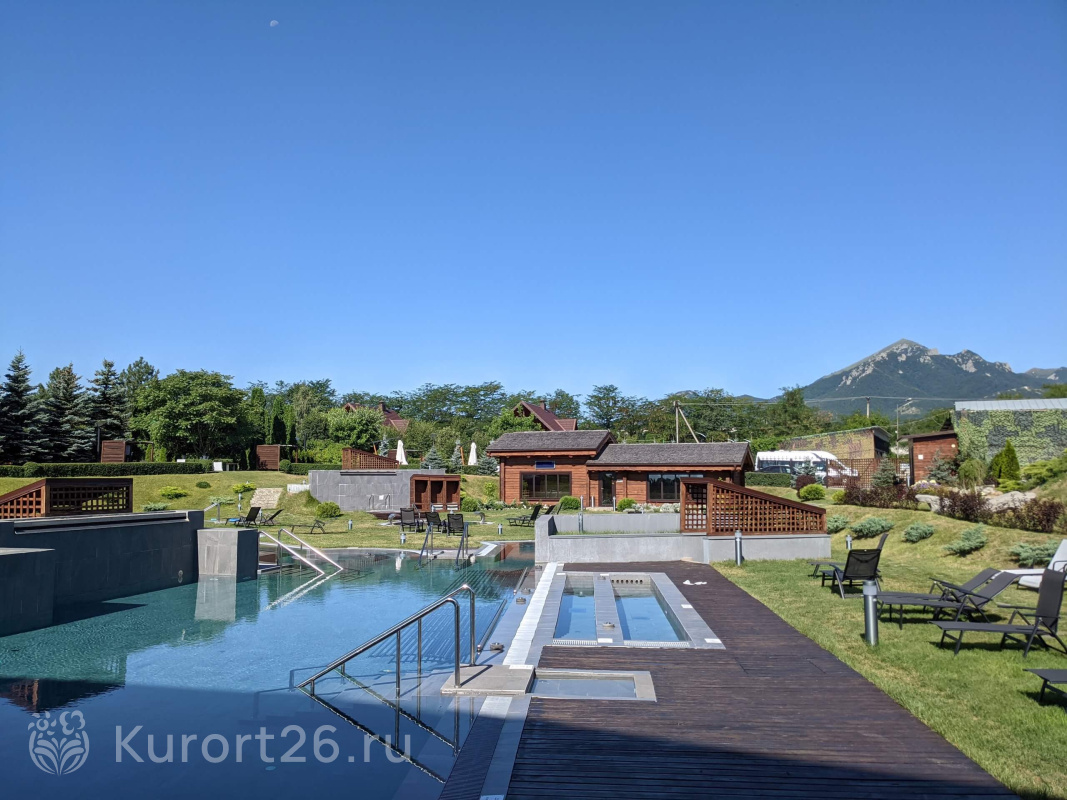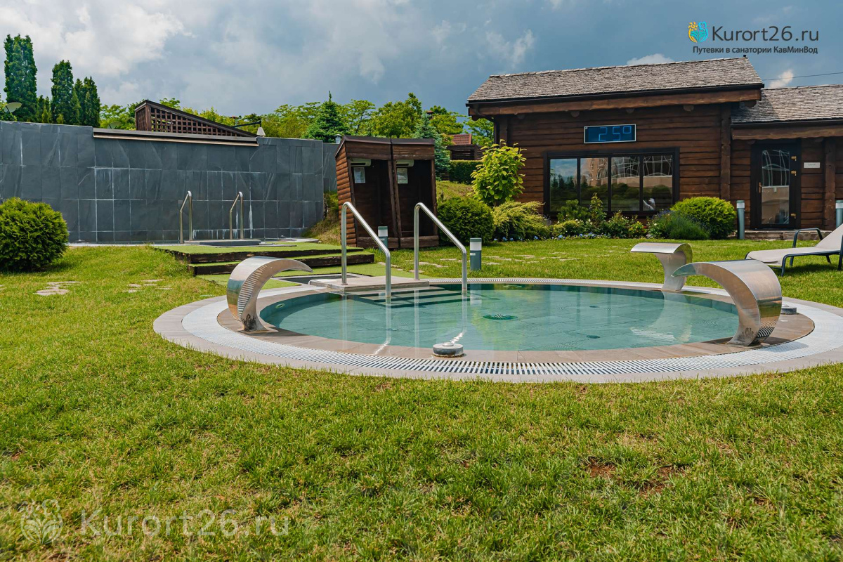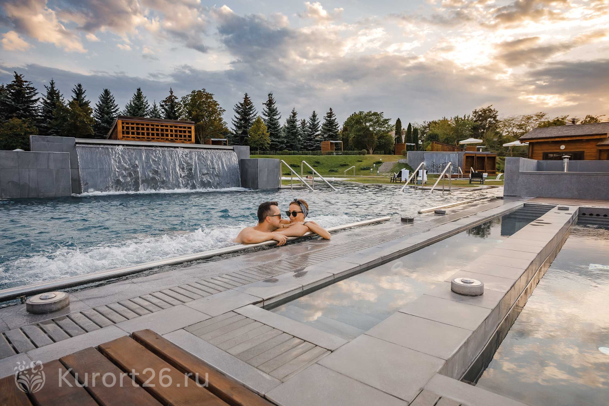 В комплексе есть большой открытый релакс-бассейн 110 кв.м с выплывом из закрытой части. Здесь же несколько открытых бассейнов с горячими минеральными источниками: три бассейна со 100% минерализацией и один с 50%. Температура источников 36 °C , что позволяет наслаждаться термальными процедурами в любое время года. Также снаружи находятся русские бани — можно окунуться в источник сразу после парной.