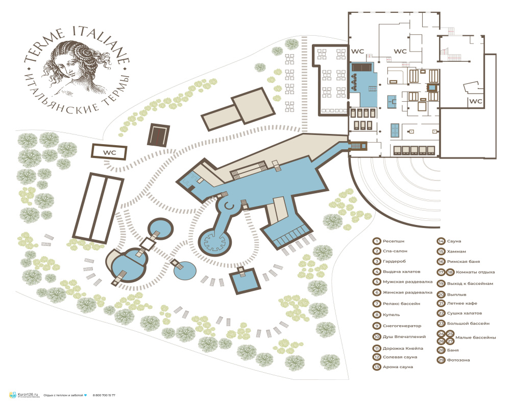 Итальянские термы — уникальный спа-комплекс на территории курорта «Машук Аква-Терм». В комплексе площадью 2,5 га есть открытые и закрытые зоны для отдыха, оздоровления и релаксации.