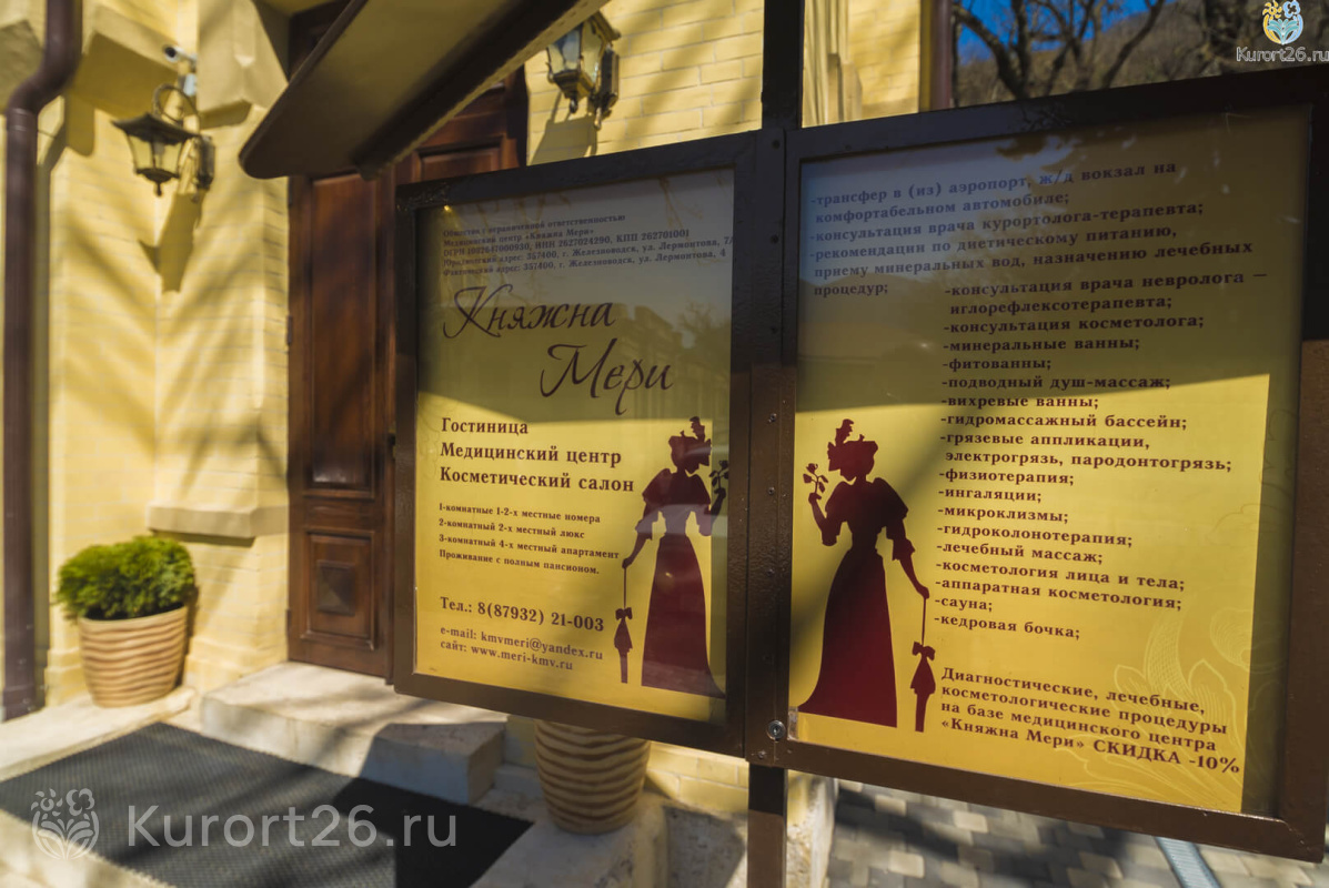 Медцентр «Княжна Мери» расположен в Лермонтовском сквере, в историческом центре Железноводска. В 200 метрах от него — источник Лермонтовский. Два корпуса лечебницы расположены в нескольких шагах друг от друга. Главный корпус является памятником архитектуры конца 19 века. Здание было отреставрировано и с 2010 года начало функционировать как санаторно-курортная лечебница. Здания лечебницы расписаны работами художников КМВ. На рисунках представлены герои произведения «Герой нашего времени», написанного М.Ю. Лермонтовым.