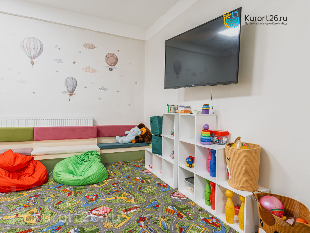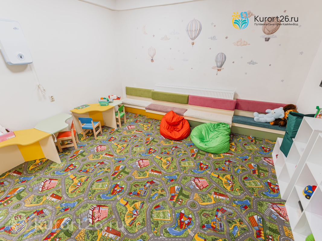 • Отдых с детьми с рождения, лечение — с 4-х лет. Детская анимация: мастер-классы, читательский клуб, развлекательные и познавательные программы, спортивные игры, творческие конкурсы. Есть игровая комната с воспитателем и детская площадка. Ведёт прием врач-педиатр