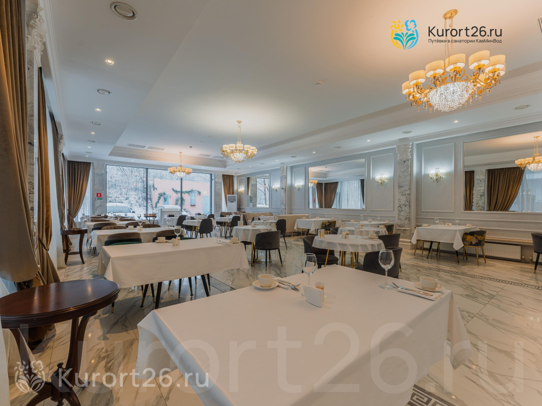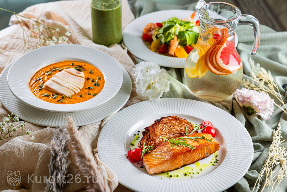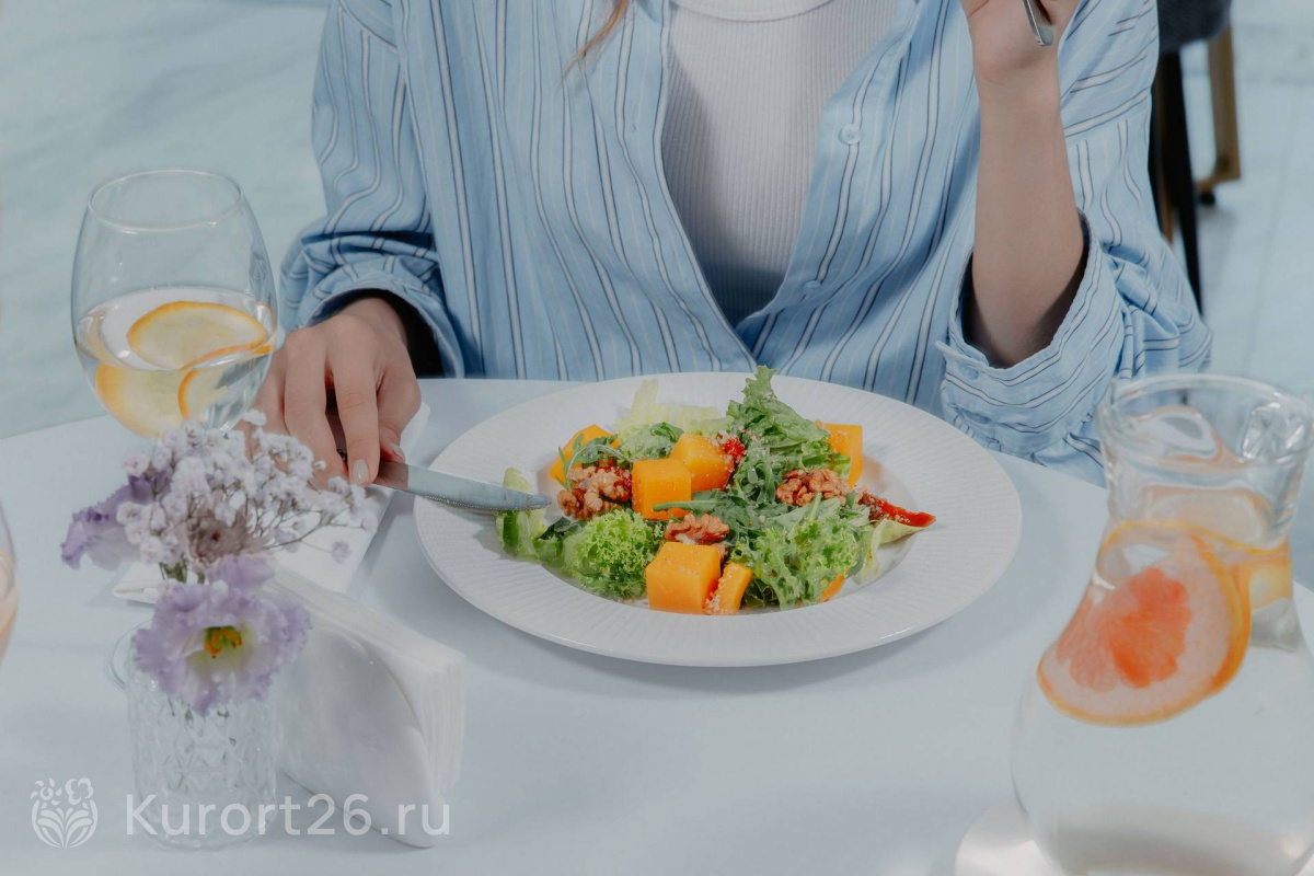 В путёвку включено трёхразовое питание «шведский стол» в ресторане. На линии большой выбор вкусных и полезных блюд — каши, супы, рыба, мясо, овощи, салаты, фрукты (апельсины, яблоки, груши, сливы, хурма). В зале установлены 2 кофемашины, стол со свежей выпечкой и здоровыми десертами.