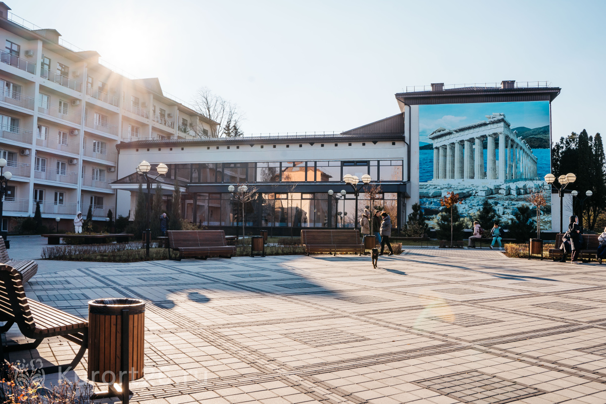 • Гости называют санаторий «затерянным раем»: расположен в Новотерской долине на берегу живописного озера в окружении гор и леса. Территория-парк 20 га с терренкуром (4 км), скверами, велодорожками, фотозоной, живописным храмом «Нерушимая стена»