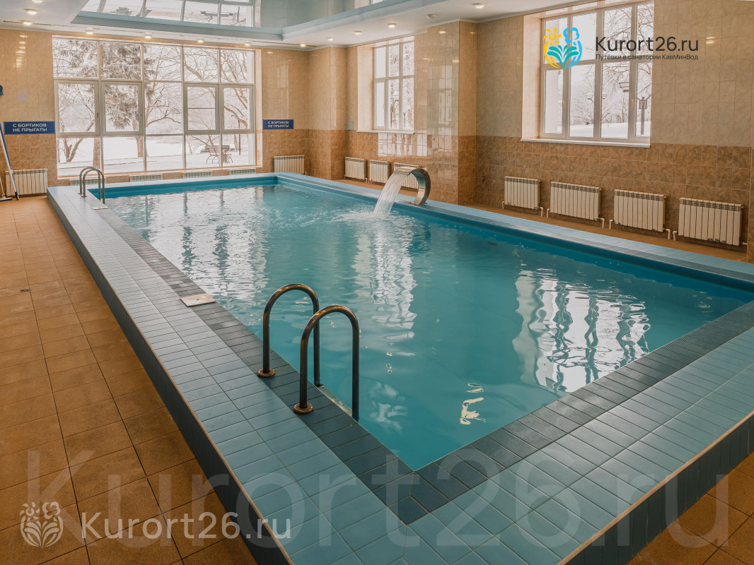 В санатории есть крытый бассейн 12×4 м с гидромассажем, гейзером и водопадом. Проводятся занятия ЛФК и лечебного плавания.