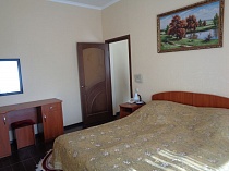холодильник, телевизор, ванные принадлежности, прикроватные тумбочки, односпальная кровать: 2 шт, стол, ванная комната