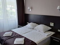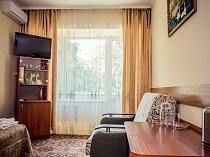 холодильник, кондиционер, телевизор, балкон, ванные принадлежности, двуспальная кровать, набор мягкой мебели, прикроватные тумбочки, утюг с гладильной доской, микроволновая печь, ванная комната