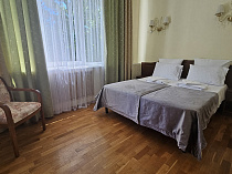 холодильник, телевизор, фен, телефон, шкаф, прикроватные тумбочки, электрочайник, сплит-система, две односпальные кровати, чайный набор, душевая кабина или ванная