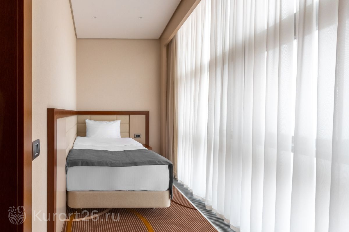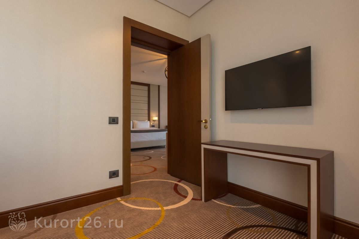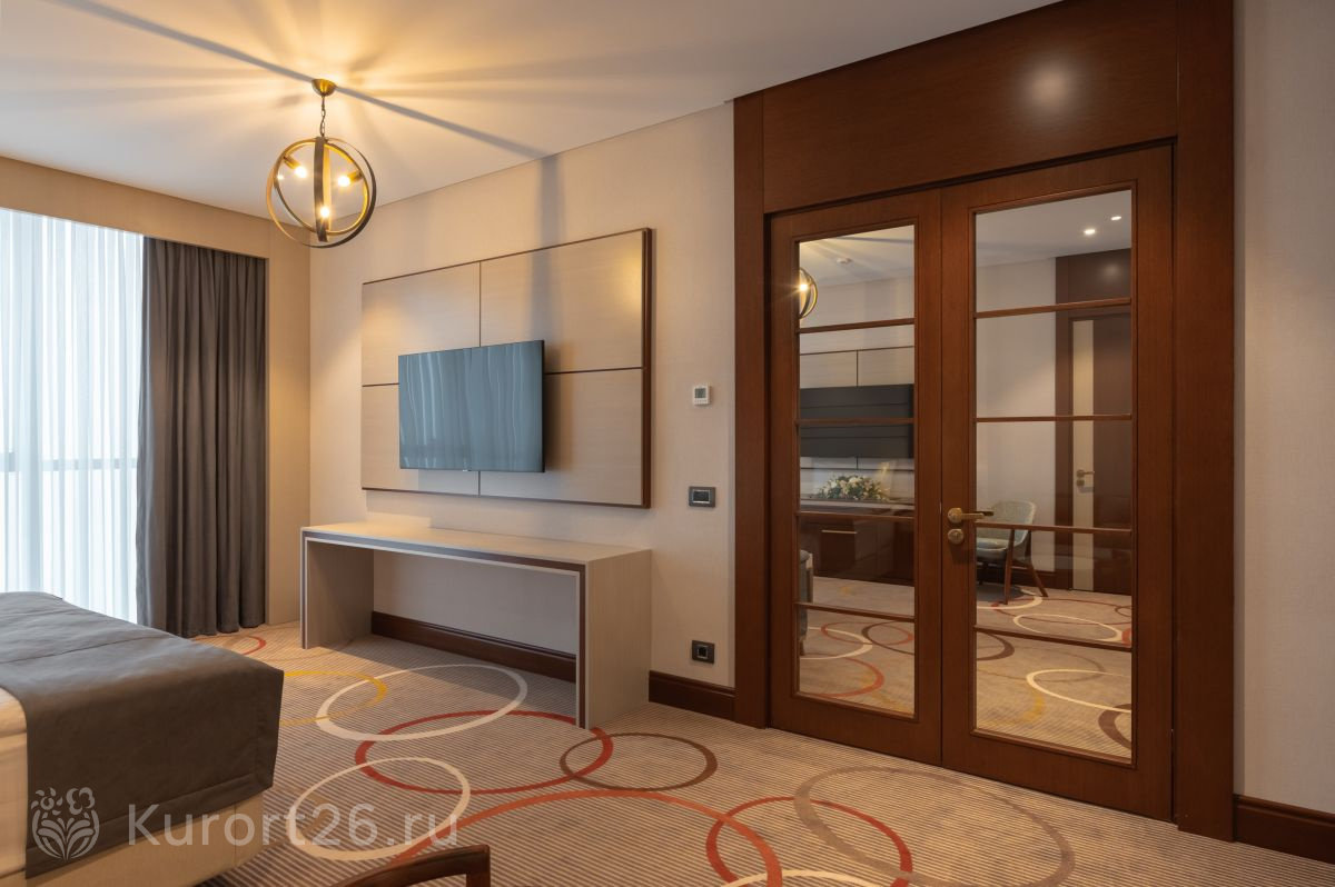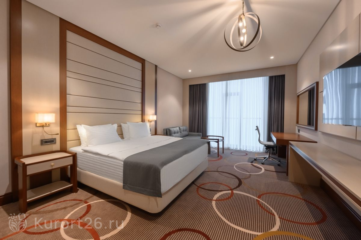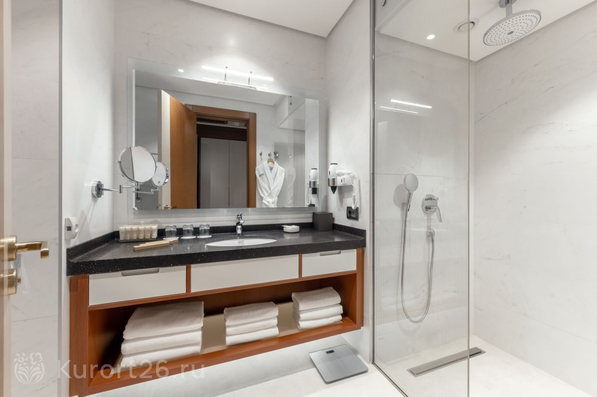 Номерной фонд включает 128 номеров площадью 36–108 кв.м. с панорамными окнами, системой климат-контроля, блэкаут шторами, шумоизоляцией и ортопедическими матрасами. Для удобства гостей корпуса соединены тёплыми переходами.
