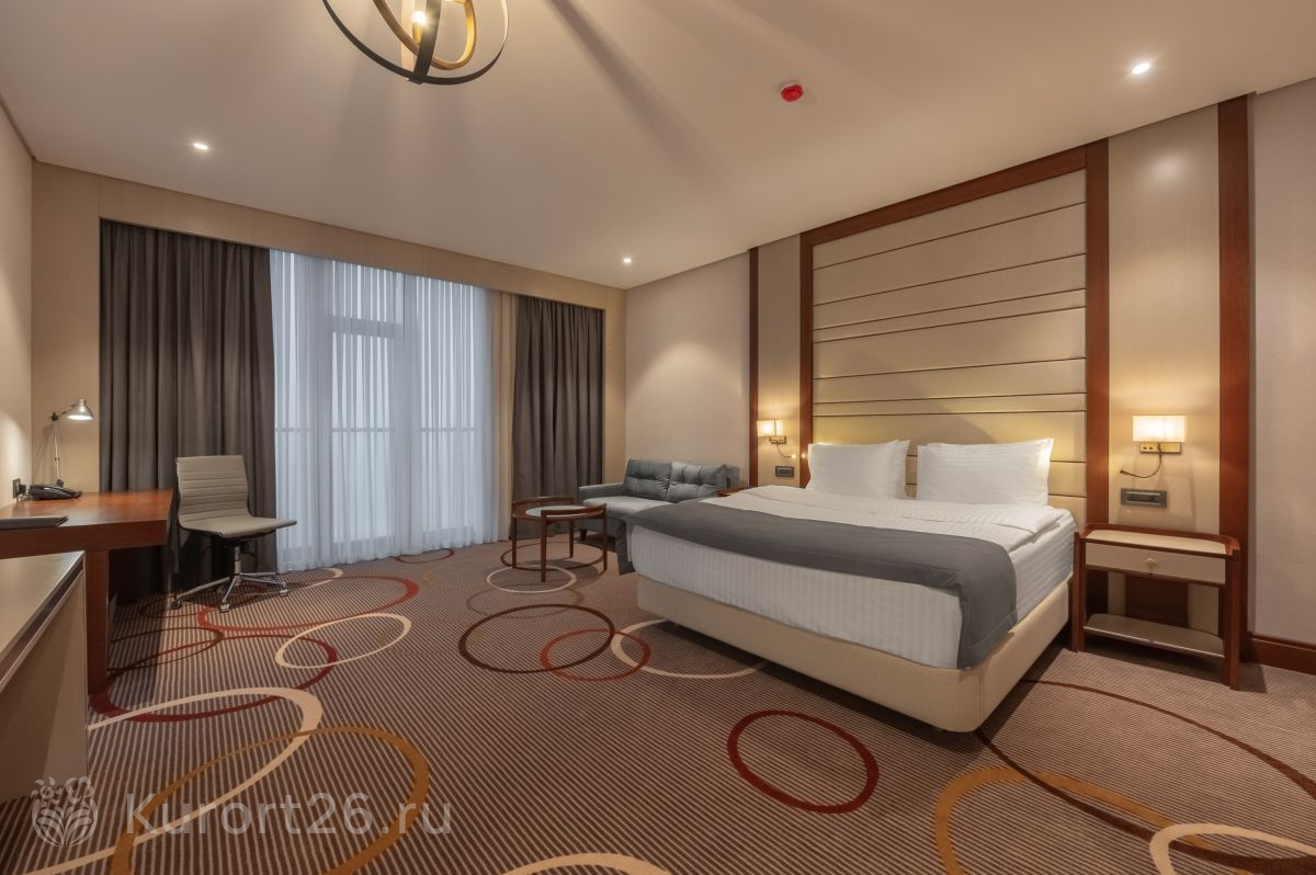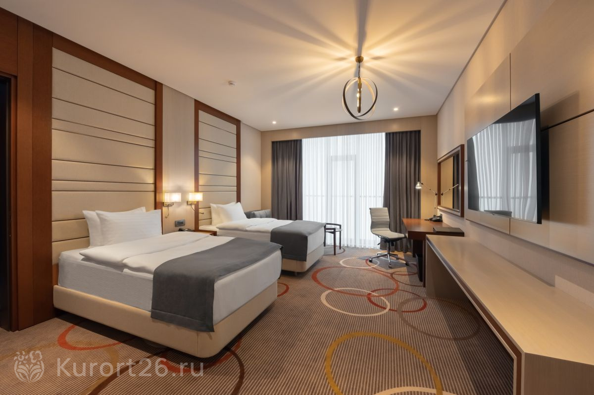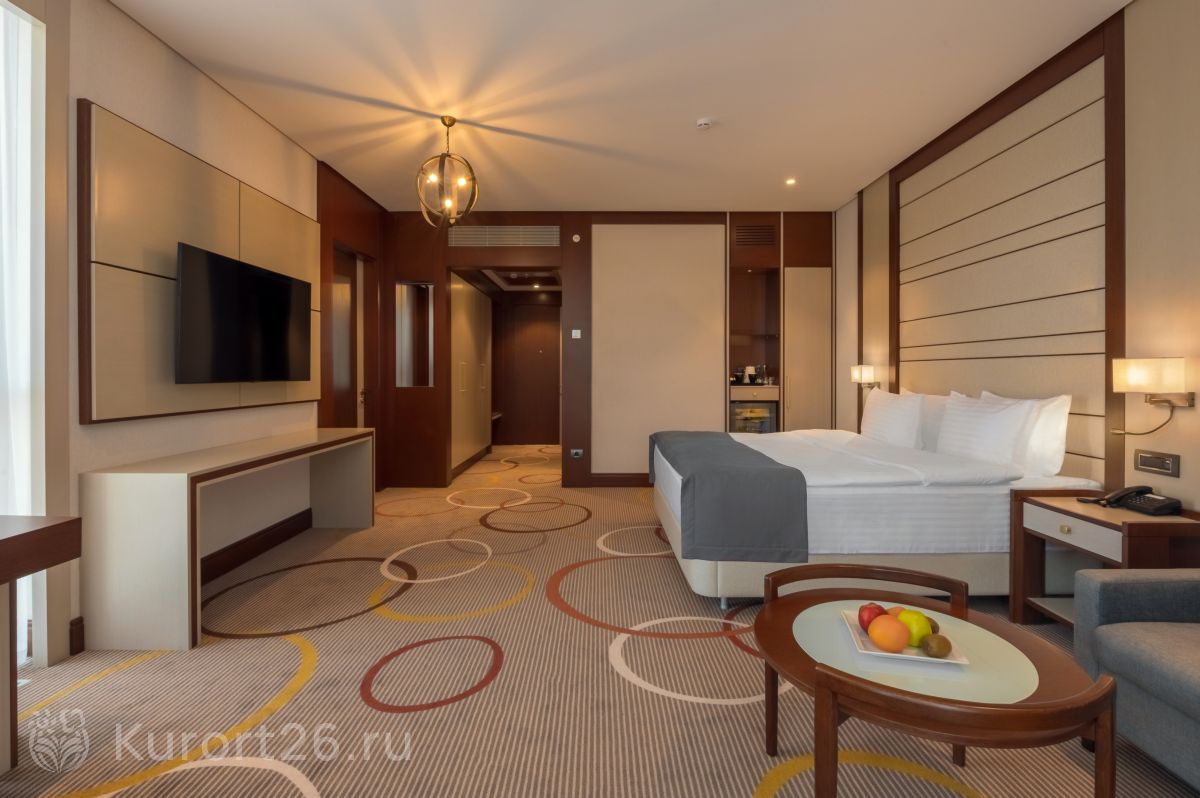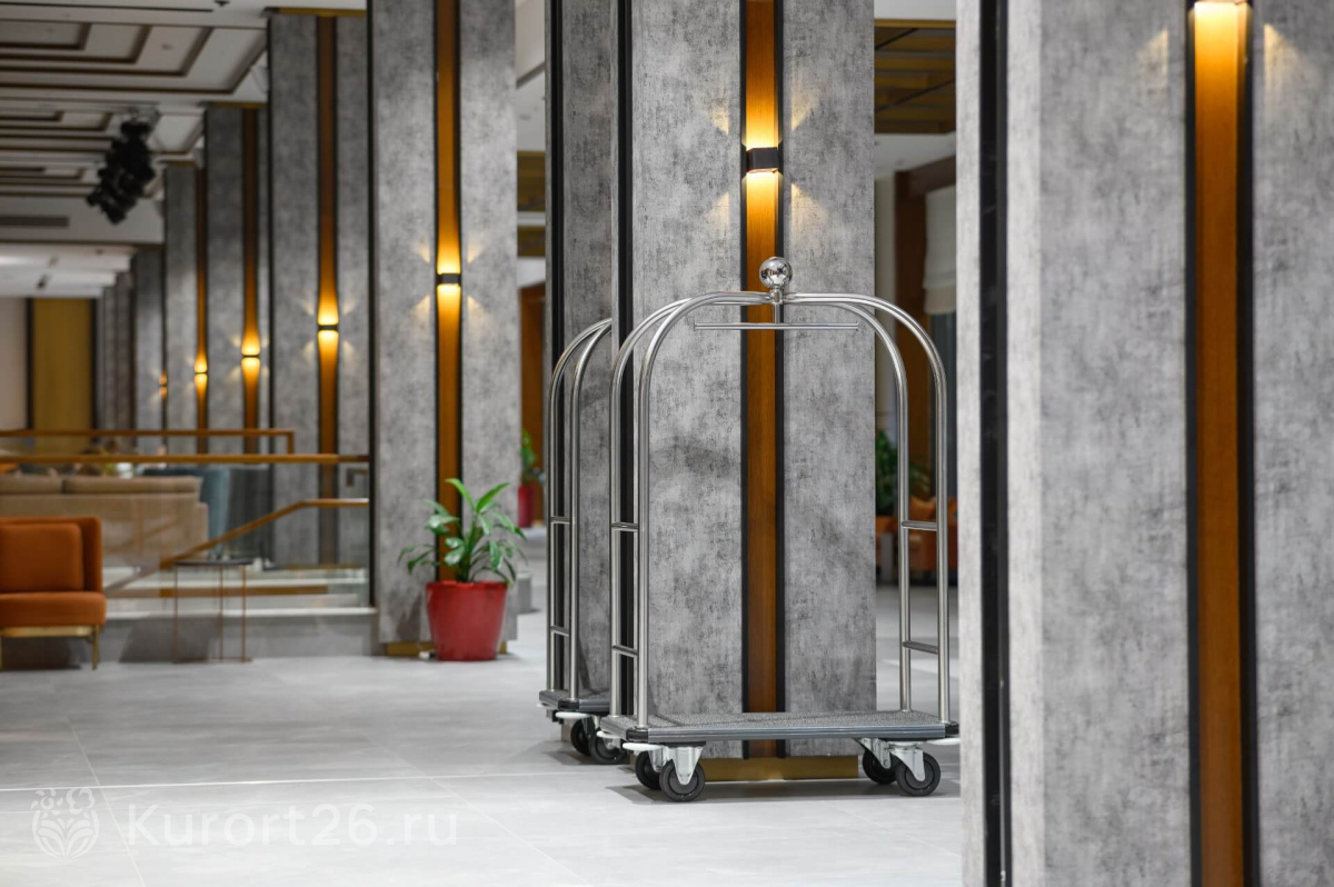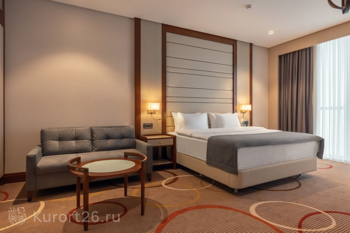 Номерной фонд включает 128 номеров площадью 36–108 кв.м. с панорамными окнами, системой климат-контроля, блэкаут шторами, шумоизоляцией и ортопедическими матрасами. Для удобства гостей корпуса соединены тёплыми переходами.