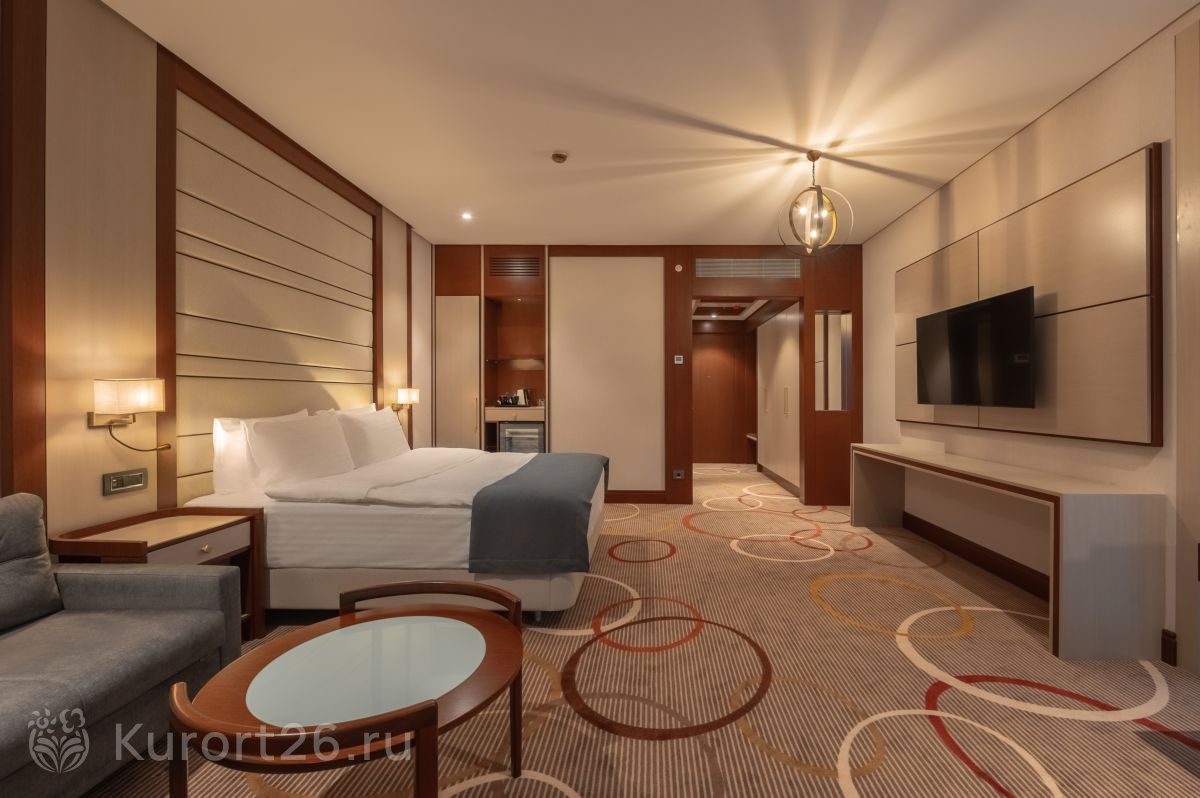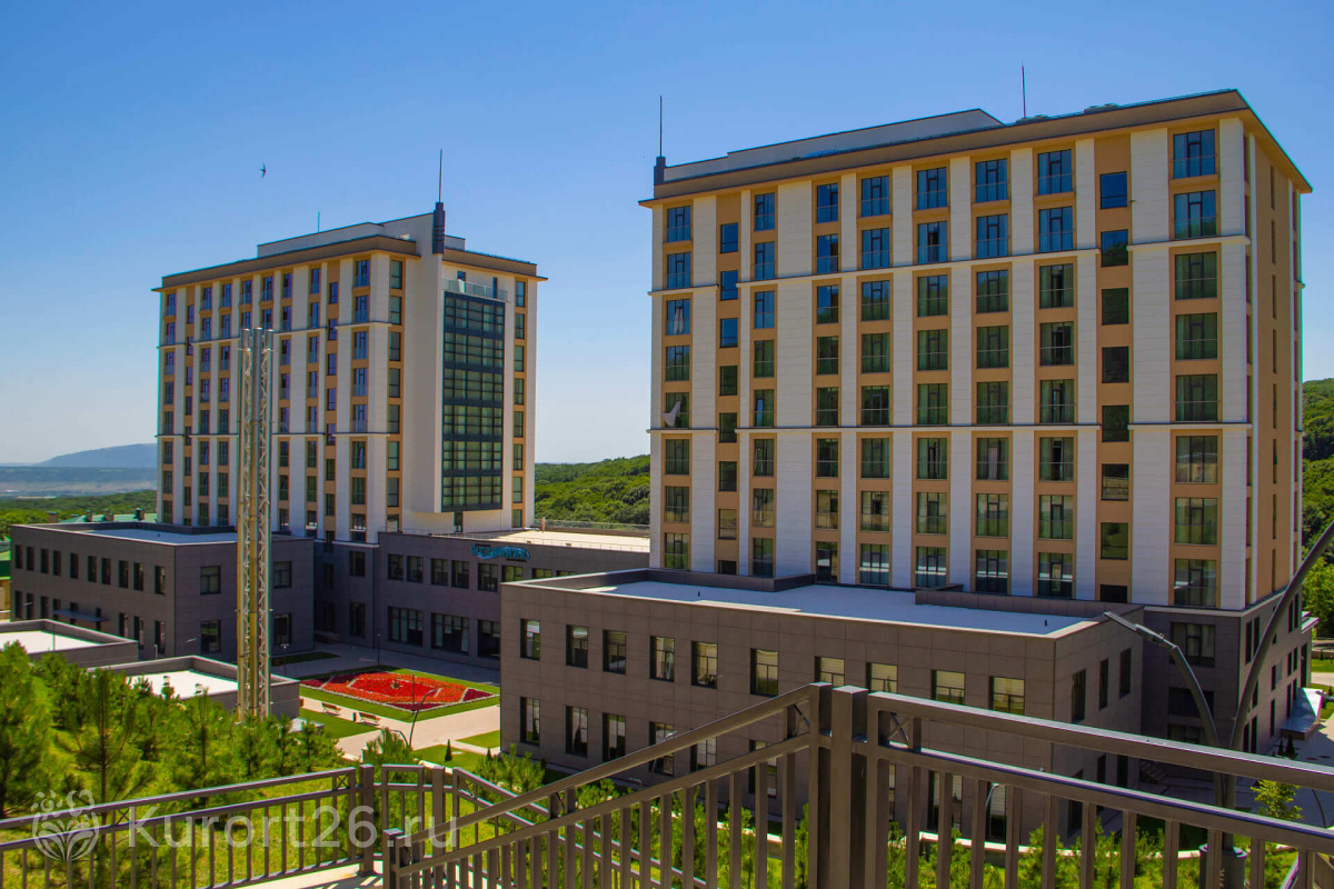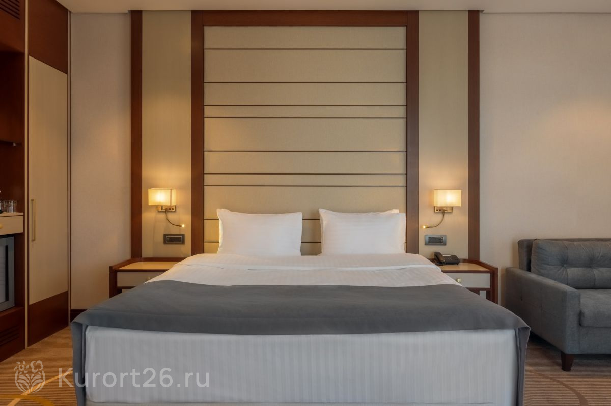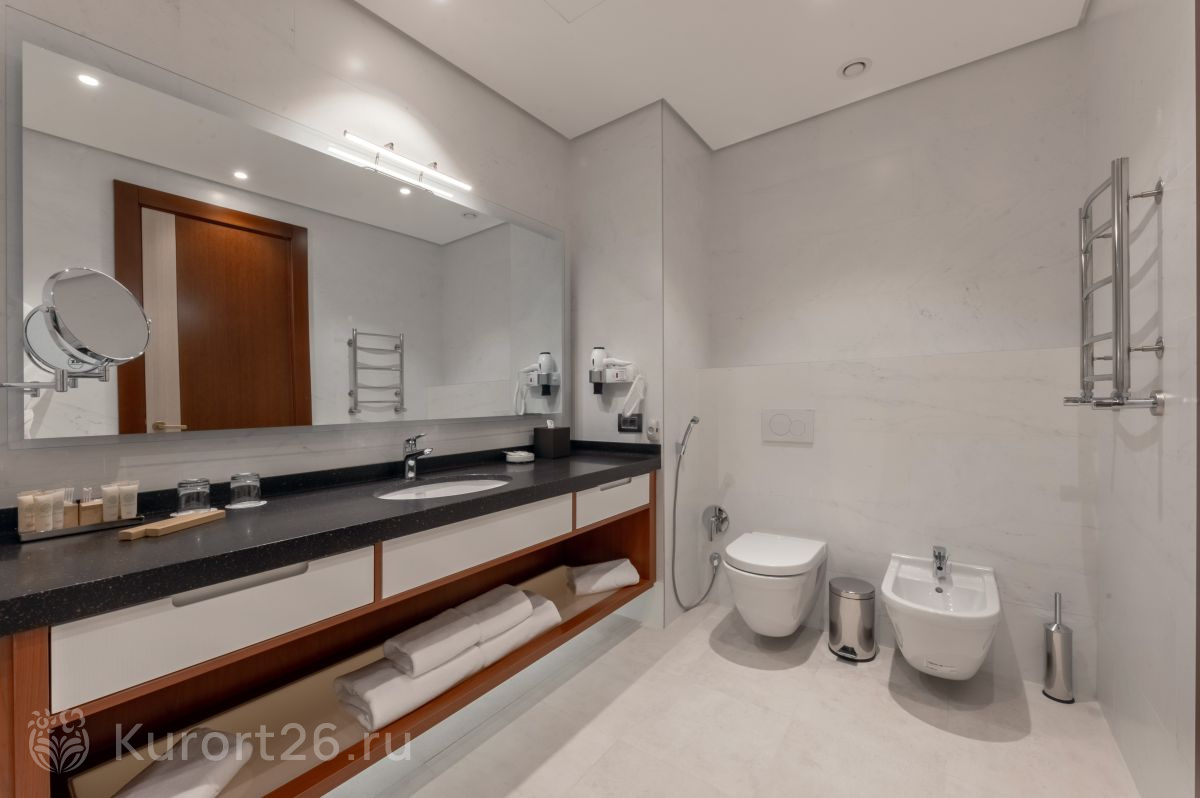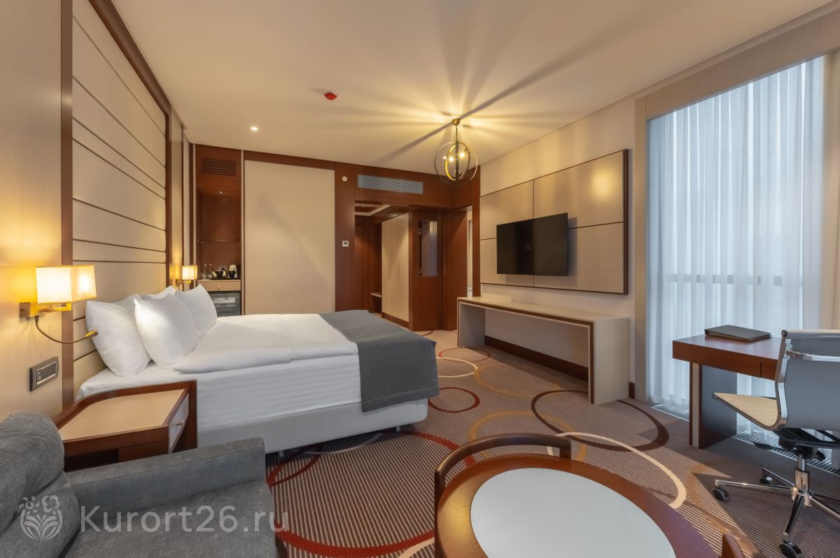 Номерной фонд включает 128 номеров площадью 36–108 кв.м. с панорамными окнами, системой климат-контроля, блэкаут шторами, шумоизоляцией и ортопедическими матрасами. Для удобства гостей корпуса соединены тёплыми переходами.
