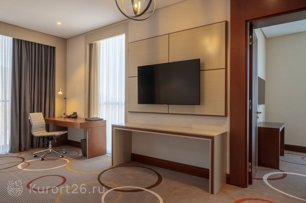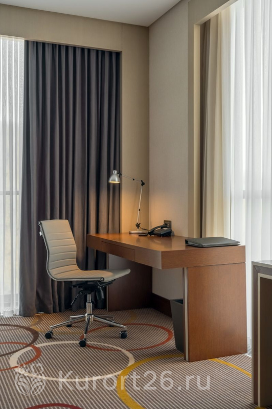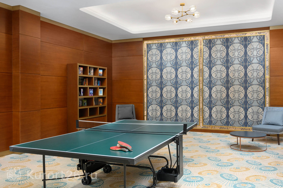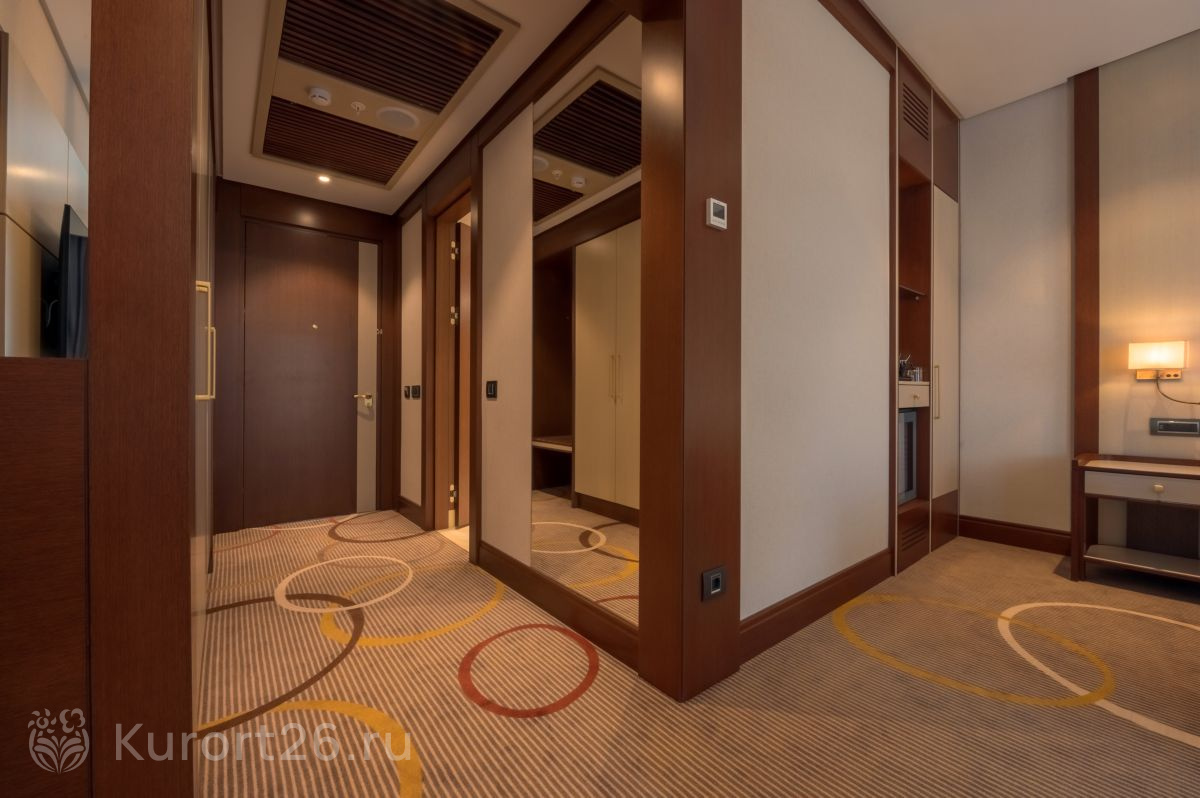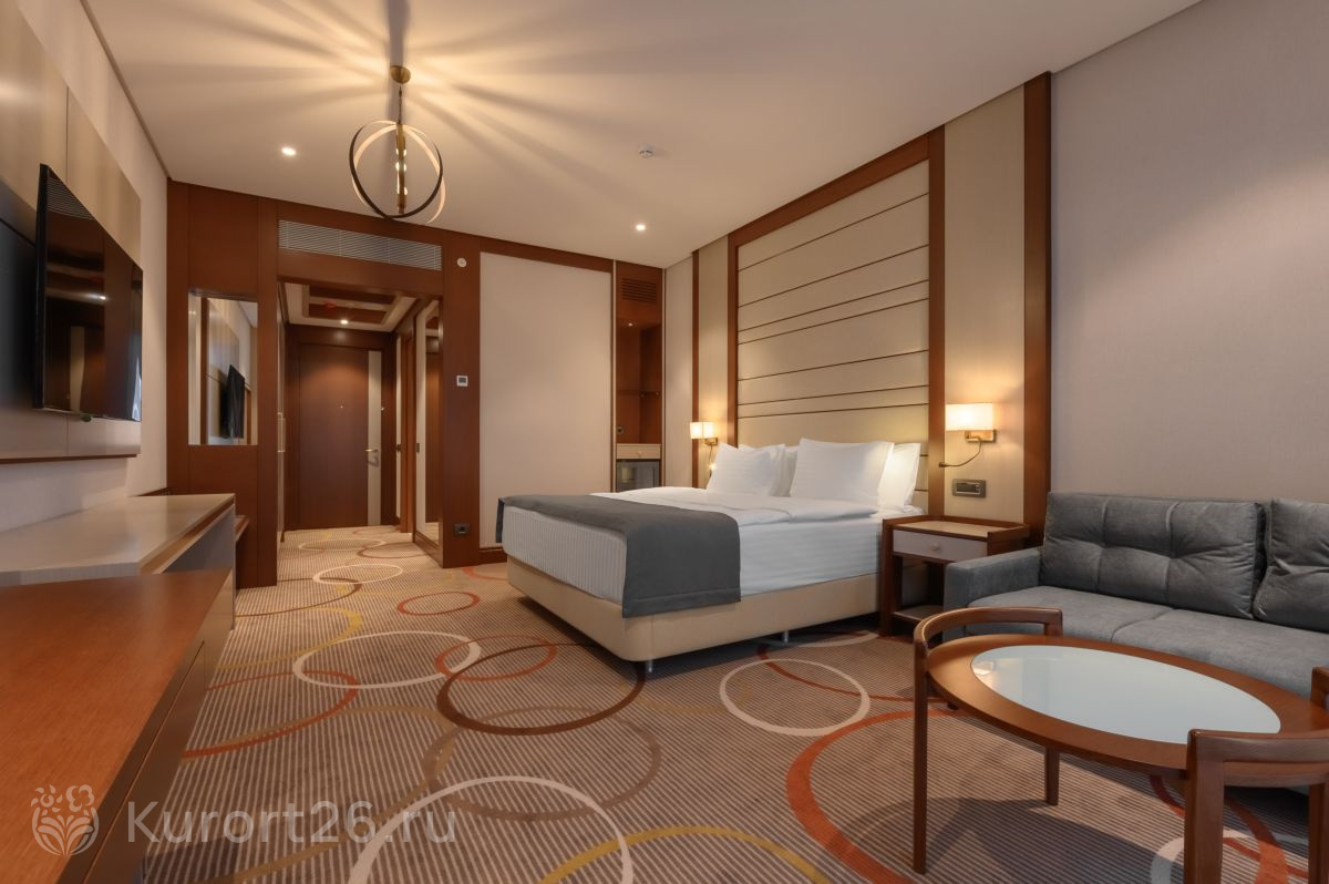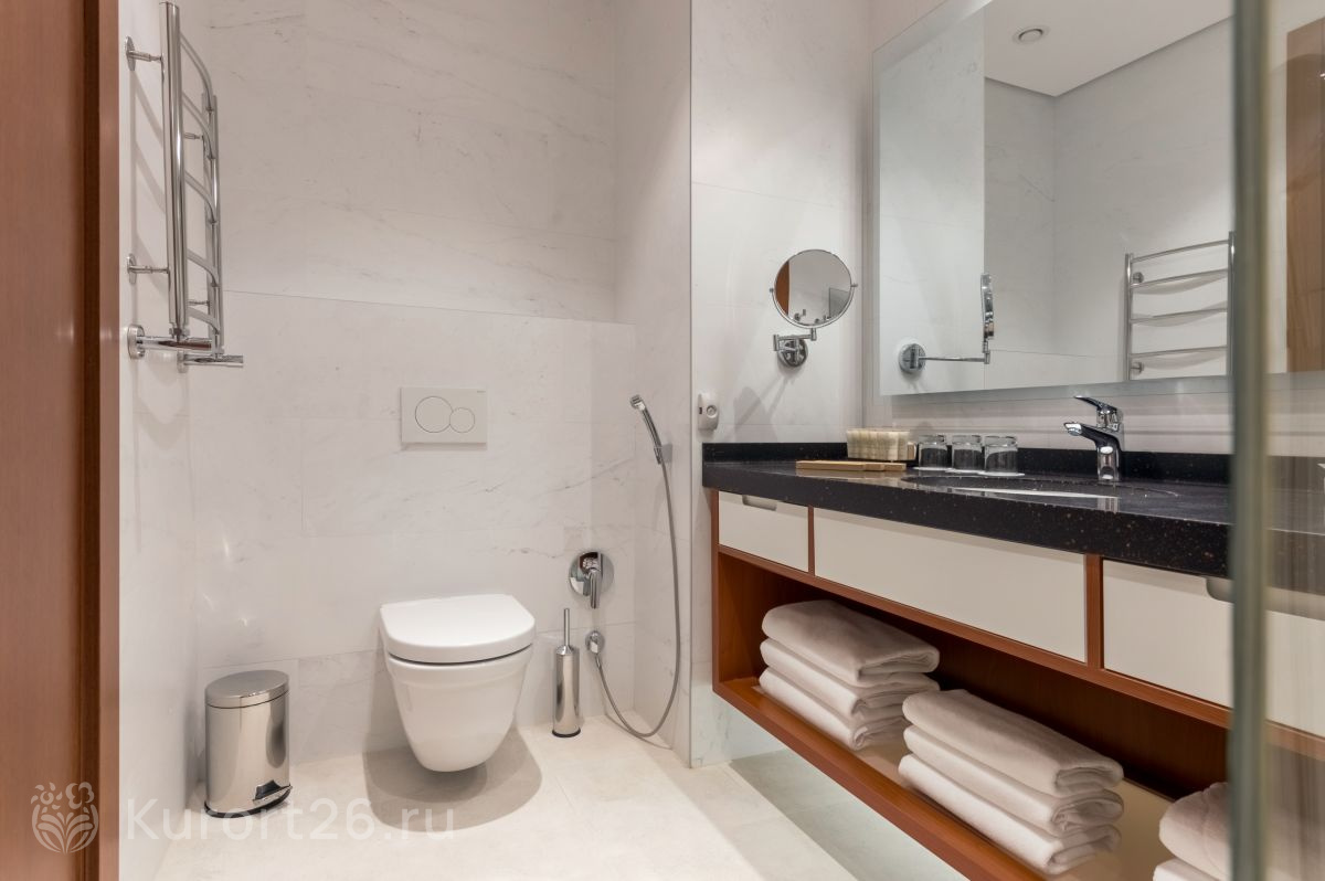 Номерной фонд включает 128 номеров площадью 36–108 кв.м. с панорамными окнами, системой климат-контроля, блэкаут шторами, шумоизоляцией и ортопедическими матрасами. Для удобства гостей корпуса соединены тёплыми переходами.