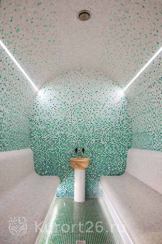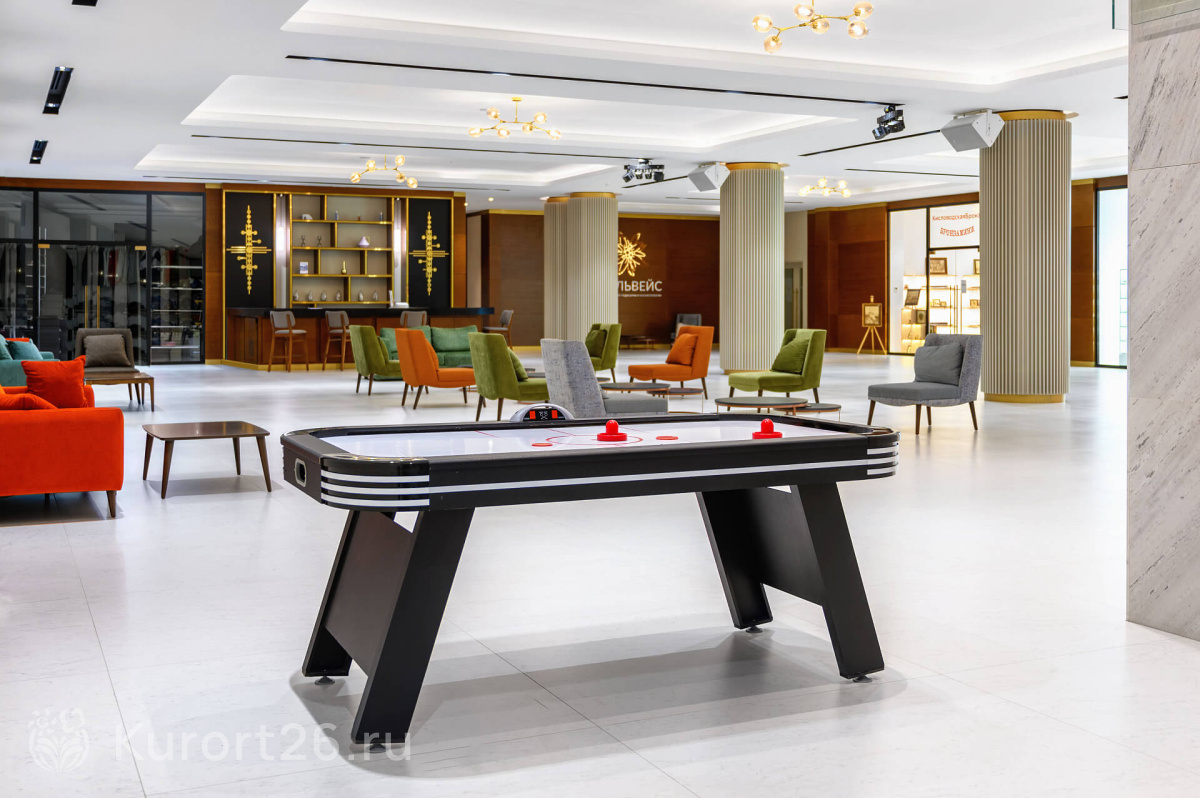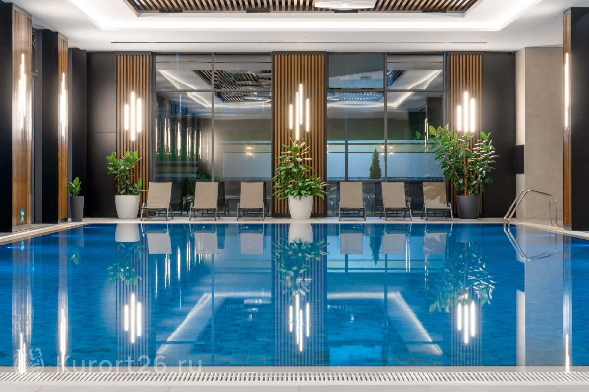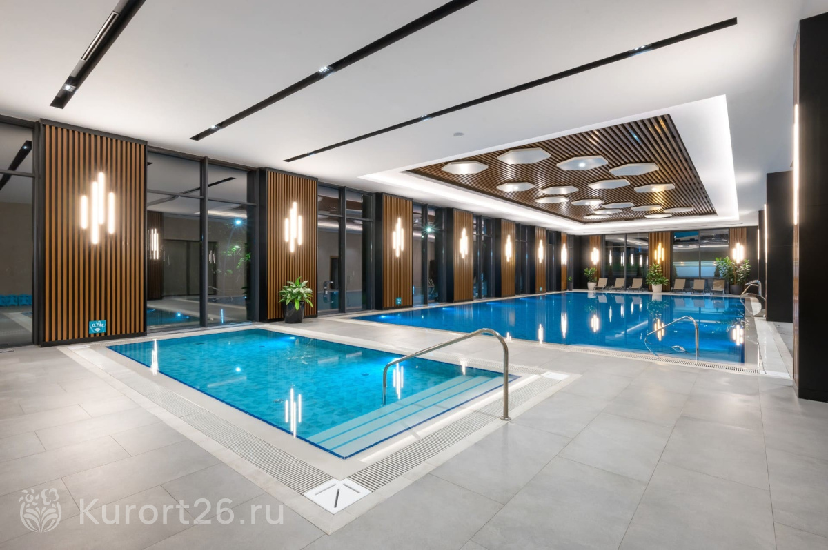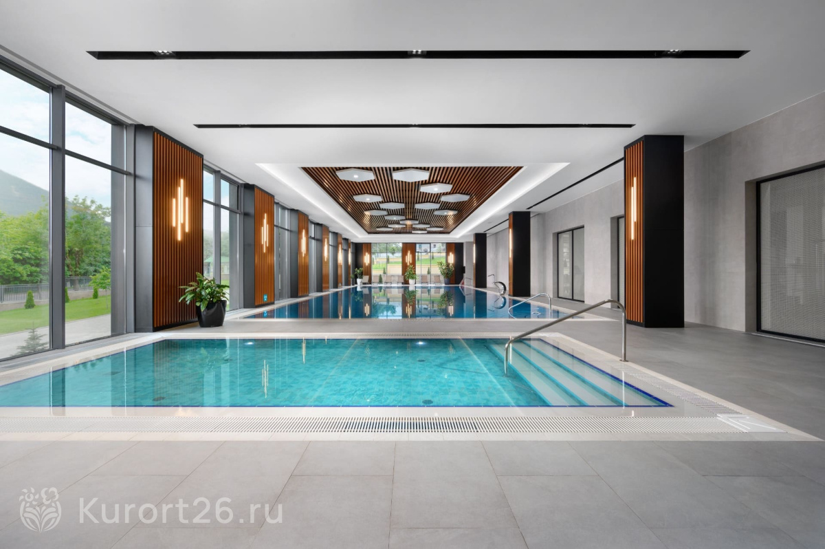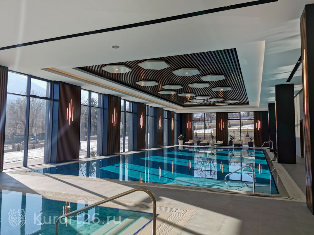 Акватермальный комплекс включает бассейн 20×9 м с гидромассажными установками, детский бассейн 6×3 м, финскую сауну, хаммам и аэросолярий с видом на горы. В спа-центре «Эдельвейс» более 200 процедур, включая аппаратную косметологию, плацентарную терапию, массажи и уходовые программы.
