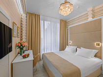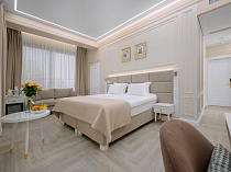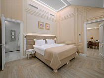 кондиционер, телевизор, чайник, фен, балкон, сейф, душ, интернет в номере, ванные принадлежности, кровати с ортопедическими матрацами, тапочки, шкаф, прикроватные тумбочки, утюг с гладильной доской, диван, стол, зеркало, кофемашина, кресло, система климат-контроля, двуспальная кровать / две односпальные кровати, халаты, набор косметических средств, набор полотенец, Душевая кабина, чайный набор, чайная станция, кровать «King size»