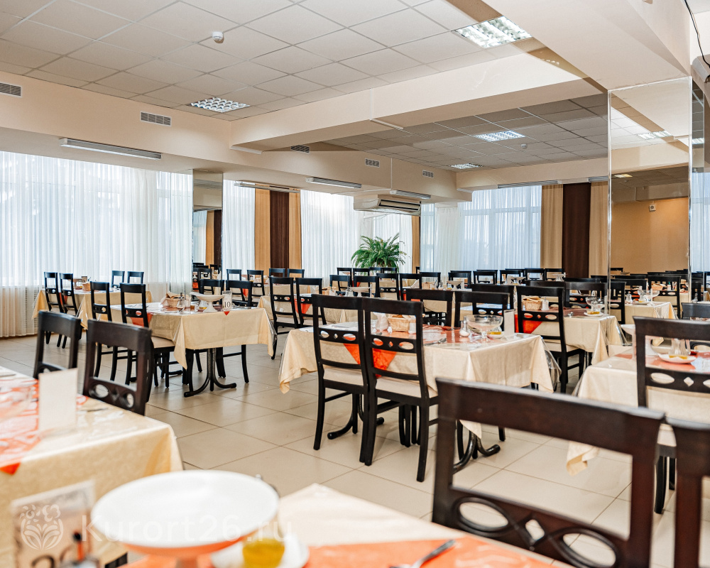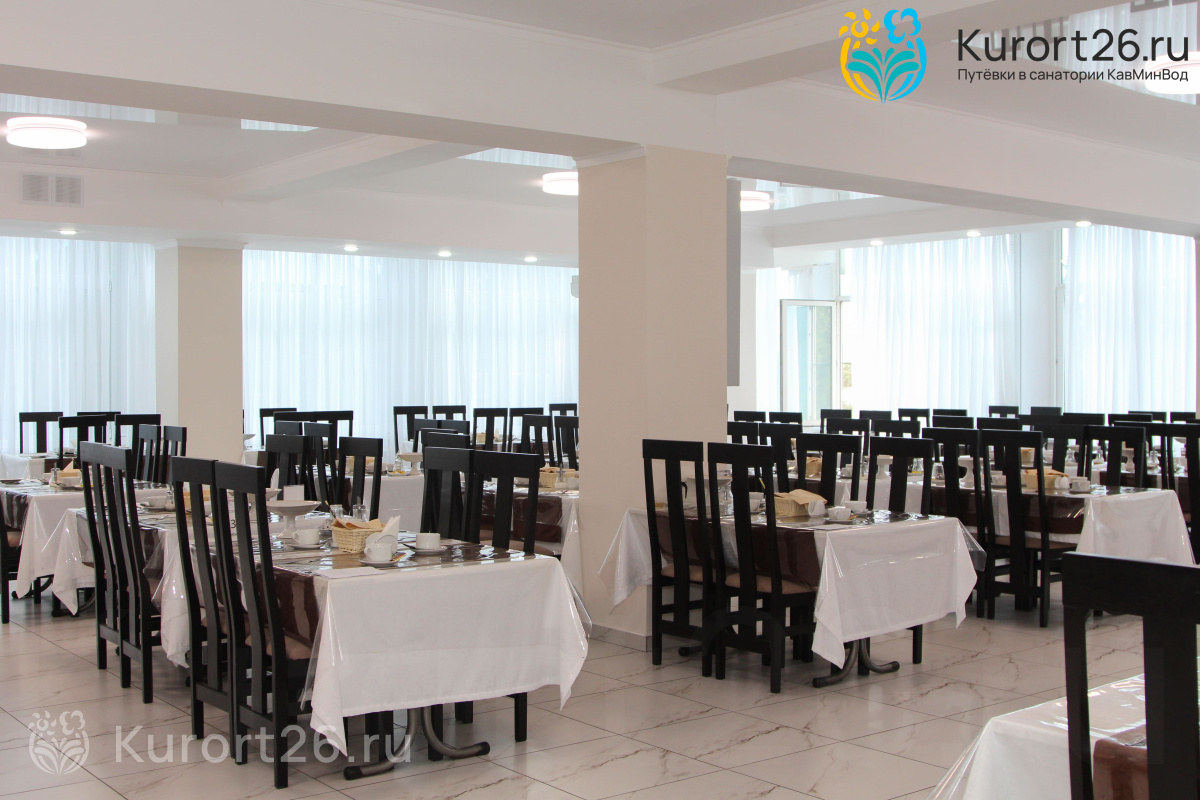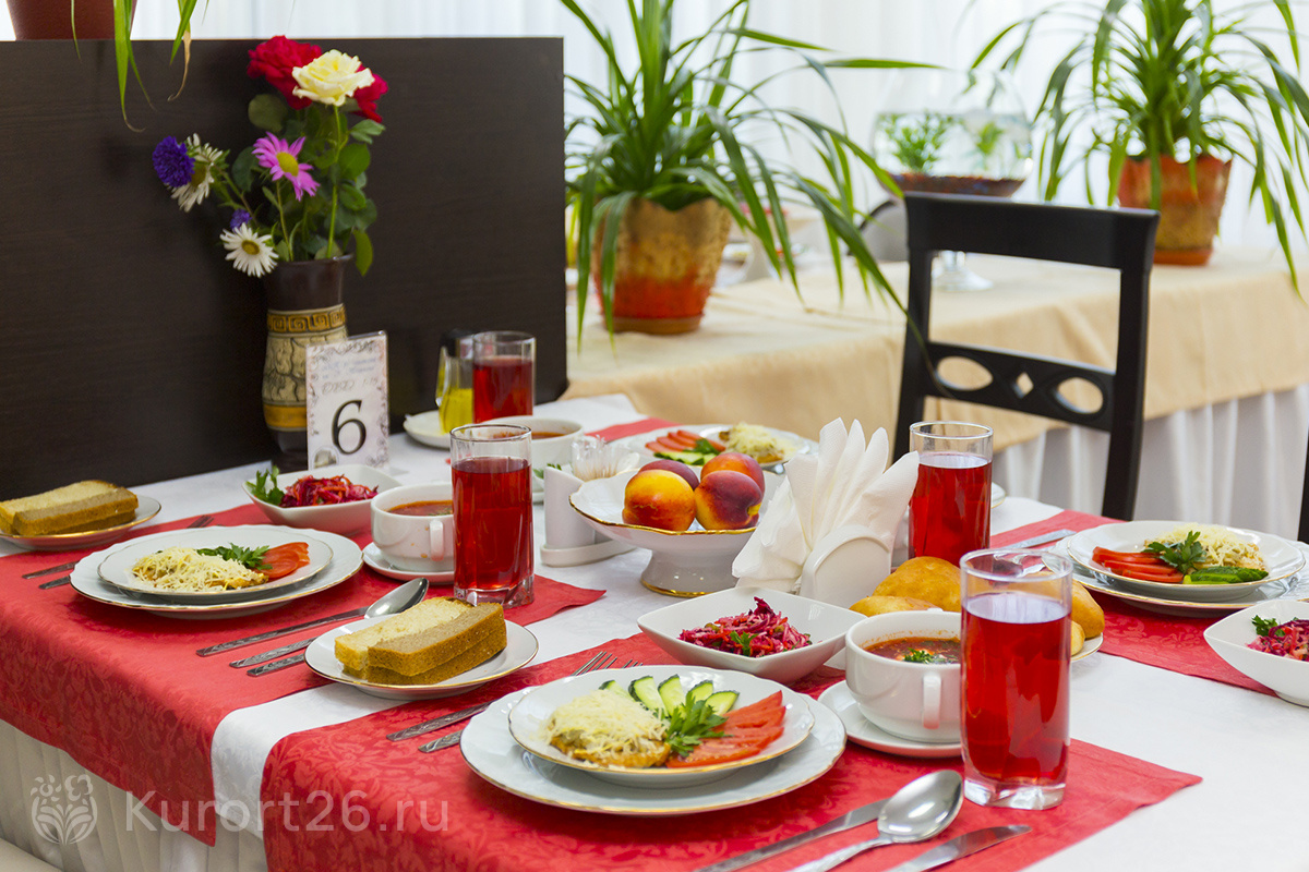В зависимости от путёвки питание 3- либо 5-разовое. В меню — большой выбор мясных, рыбных, крупяных и молочных блюд. Есть также вегетарианские, постные и диетические блюда. По желанию вы сможете получить консультацию диетолога. Для детей в столовой дают полдник, в него входят выпечка, сладости, фрукты и соки.