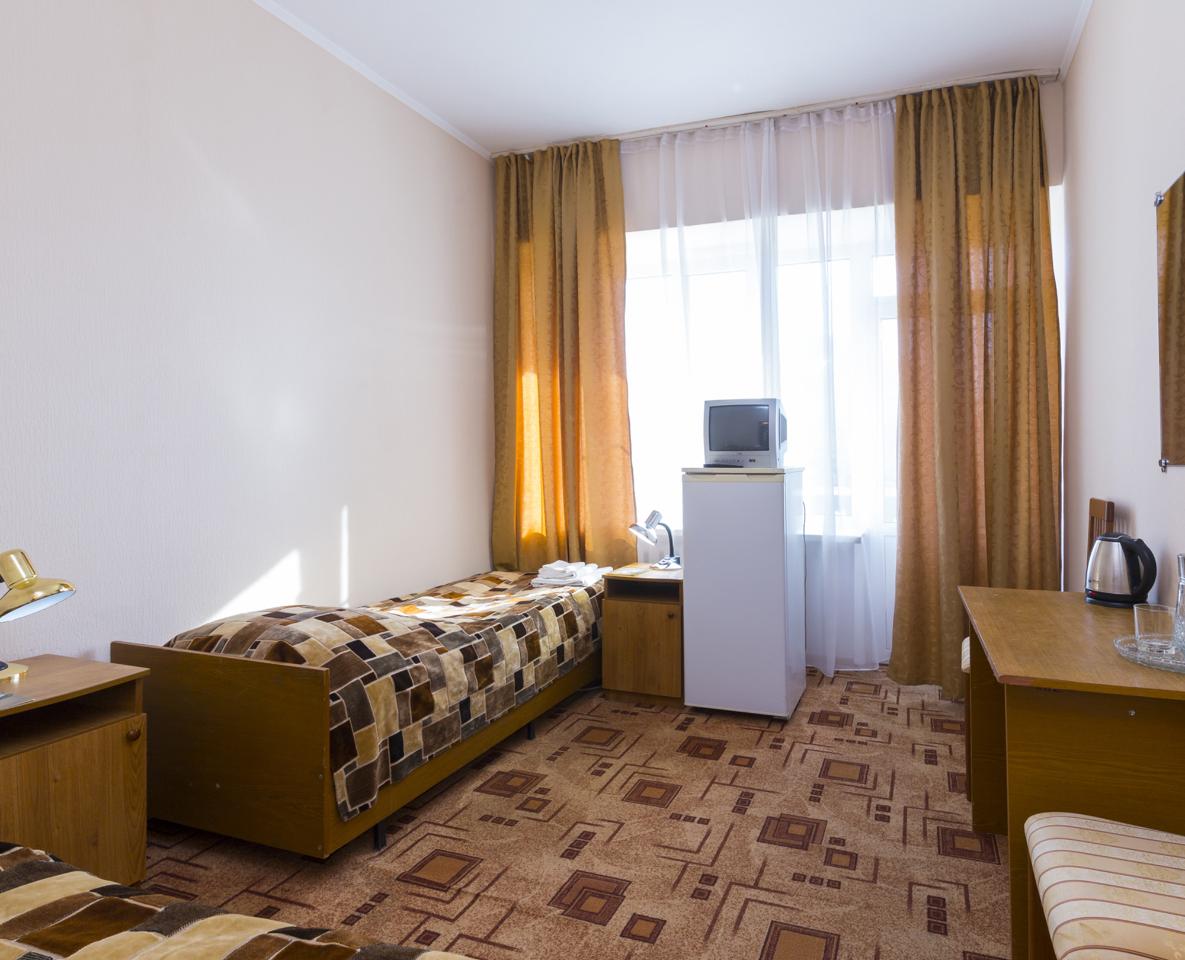 холодильник, телевизор, набор чайной посуды, санузел с душевой кабиной, ванные принадлежности, шкаф, прикроватные тумбочки, электрочайник, стол, две односпальные кровати