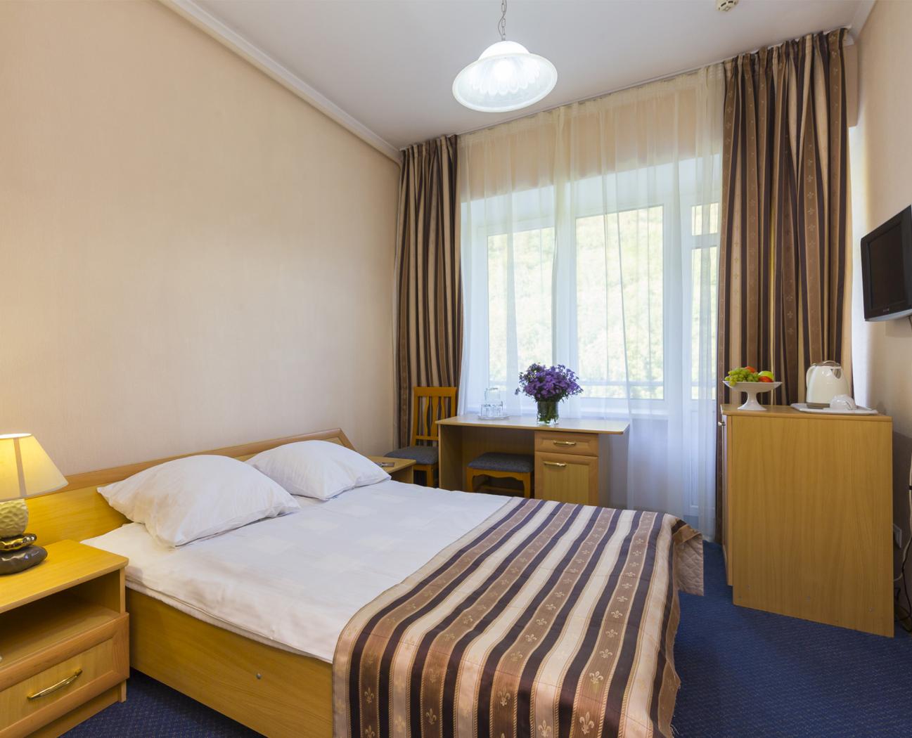 холодильник, телевизор, санузел с душевой кабиной, ванные принадлежности, двуспальная кровать, шкаф, прикроватные тумбочки, стол