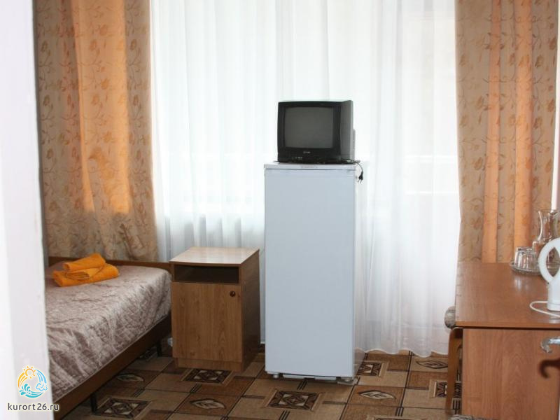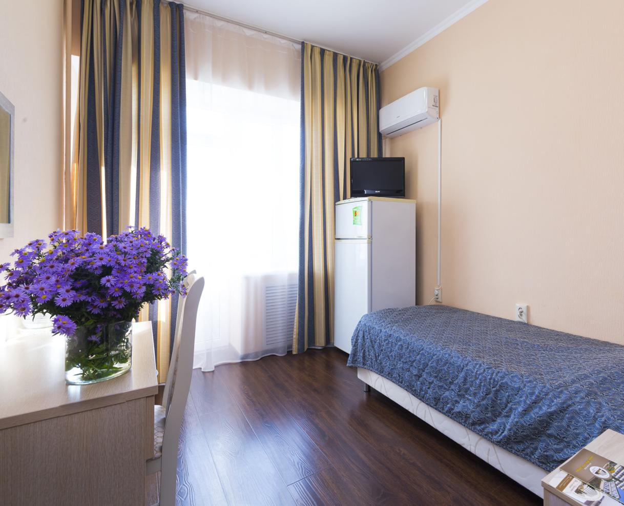 холодильник, телевизор, чайник, санузел с душевой кабиной, ванные принадлежности, шкаф, односпальная кровать, стол, прикроватная тумба