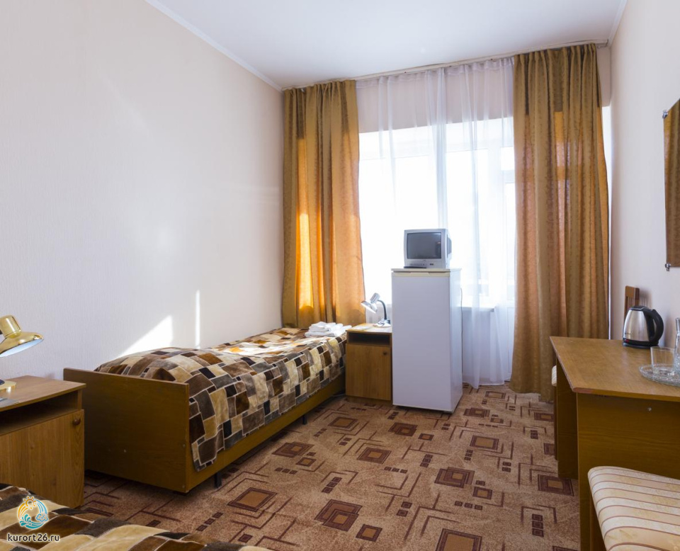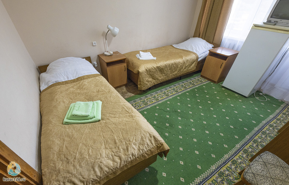 холодильник, телевизор, набор чайной посуды, санузел с душевой кабиной, ванные принадлежности, шкаф, прикроватные тумбочки, электрочайник, стол, две односпальные кровати