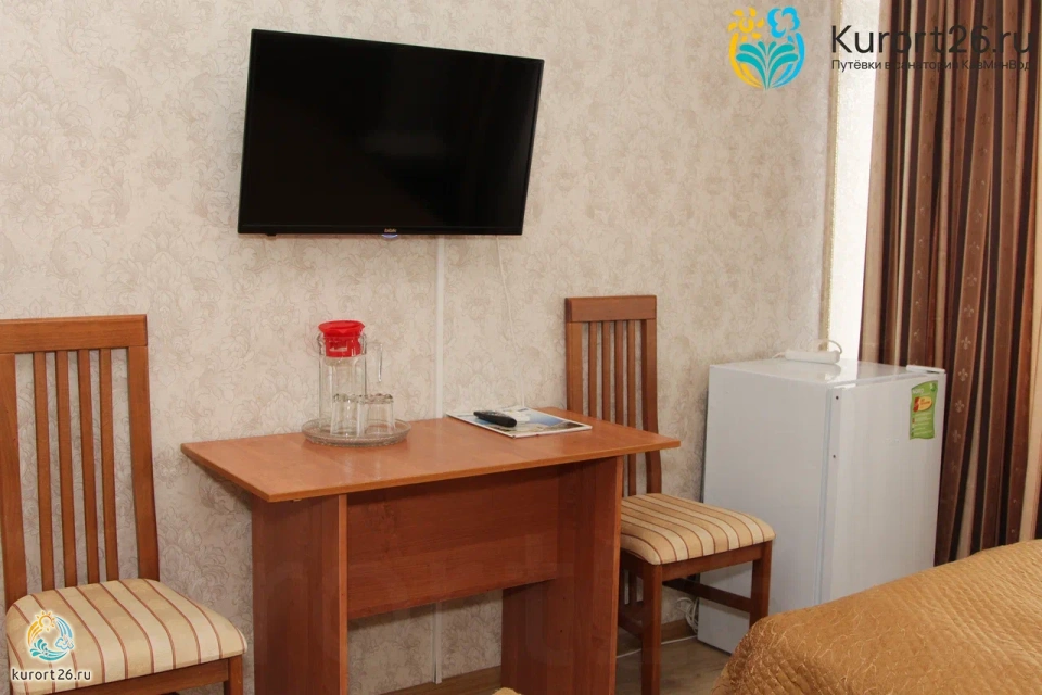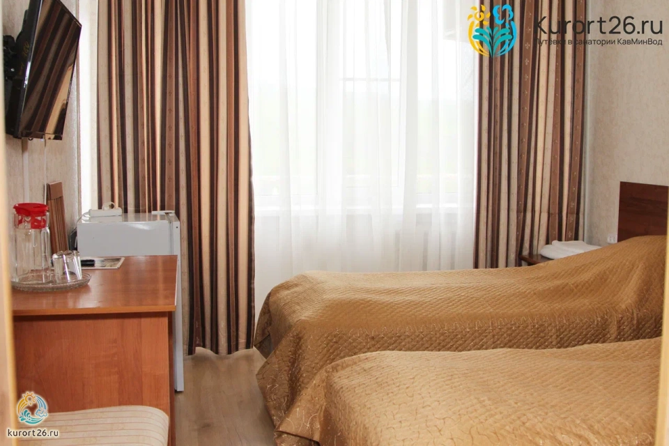 холодильник, телевизор, набор чайной посуды, санузел с душевой кабиной, ванные принадлежности, шкаф, прикроватные тумбочки, электрочайник, стол, две односпальные кровати