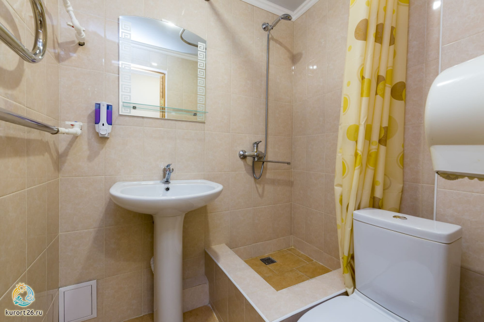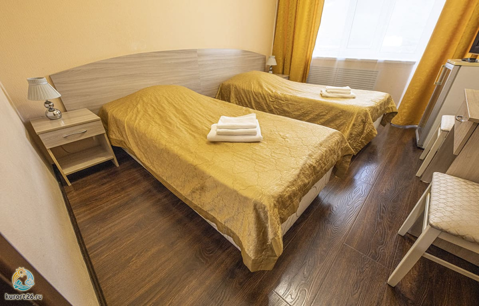 холодильник, телевизор, набор чайной посуды, санузел с душевой кабиной, ванные принадлежности, шкаф, прикроватные тумбочки, электрочайник, стол, ванная комната, две односпальные кровати